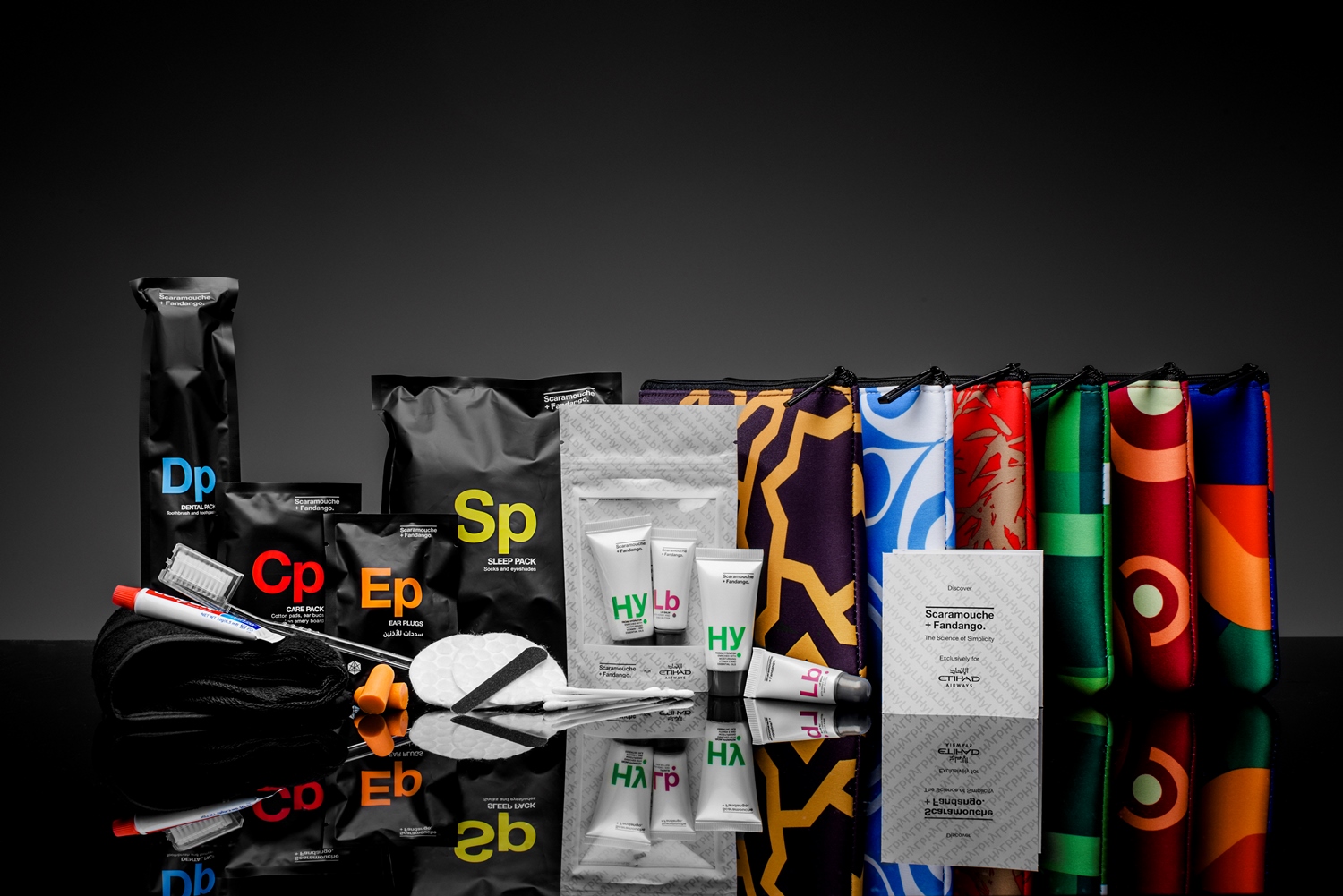 Scaramouche + Fandango ha realizzato un esclusivo kit di cortesia e un’offerta di prodotti per la cura del corpo unisex in collaborazione con Etihad Airways. Appositamente formulata per la cura della pelle durante il volo, la gamma è composta da prodotti senza parabeni e ad alto contenuto di ingredienti naturali per migliorare il benessere a bordo.