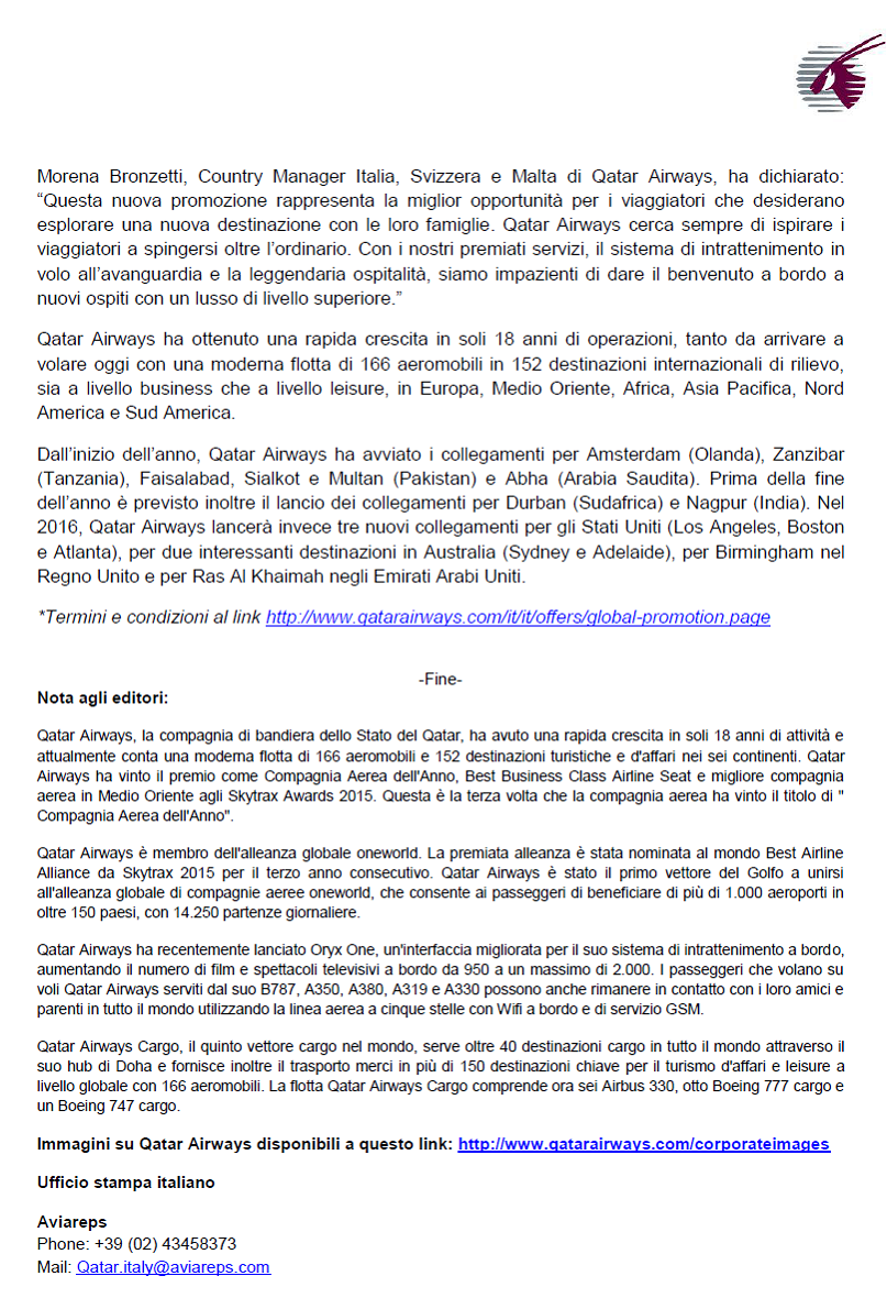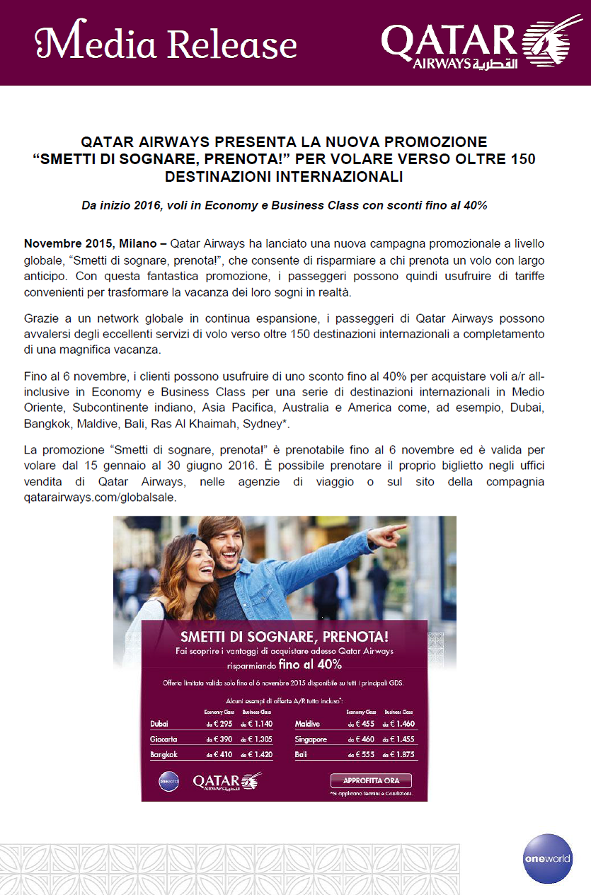 Qatar Airways lancia la promozione “Smetti di sognare! Prenota!”