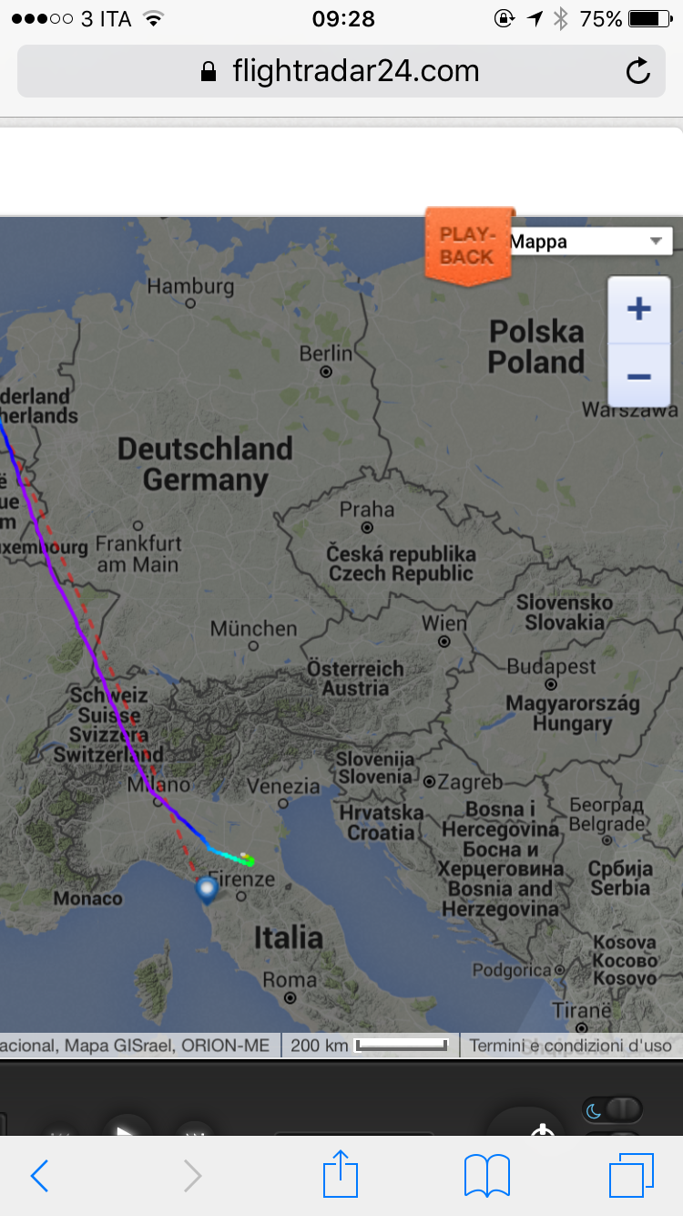 Come riportano le immagini tre aerei sono attualmente in holding sul mare di fronte a Livorno per attendere miglioramenti a Pisa. Si tratra dei voli Ryanair da Brindisi e Palermo ed un A320 easyJet.com da Parigi CDG.