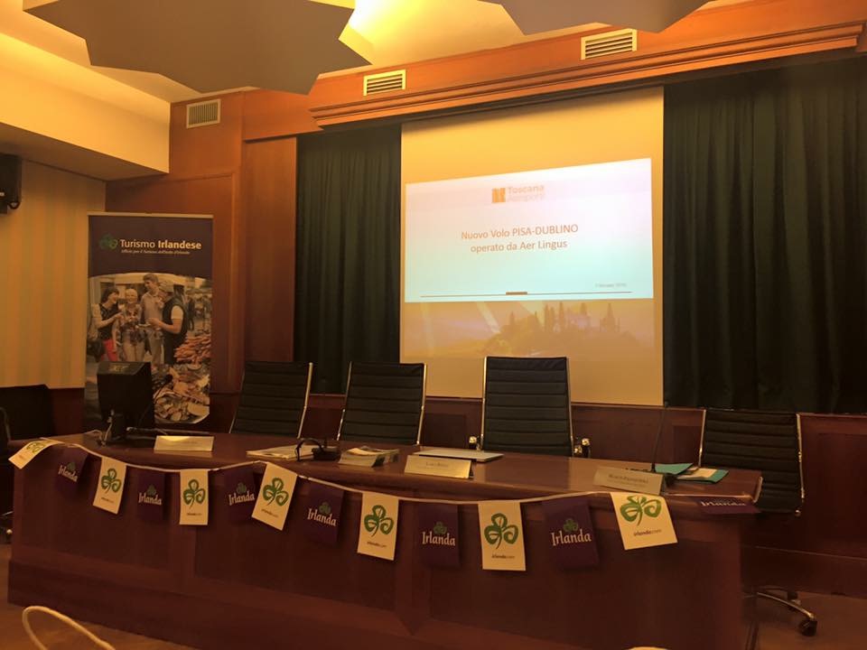 Con una magistrale puntualita’ e’ iniziata alle 12 la presentazione del volo Pisa-Dublino di Aer Lingus che aggiunge la sua nona destinazione in Italia. Al tavolo della conferenza: Linda Stivala per Toscana Aeroporti SpA, Marco Pignaioli di ID Network che cura le PR in Italia per Aer Lingus, Lara Roma del GSA Aviareps.
