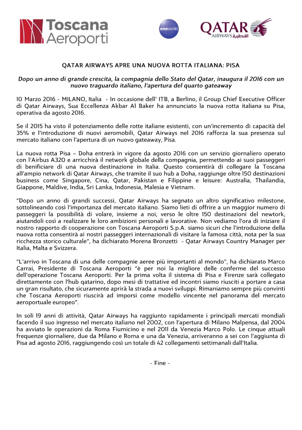 Il comunicato stampa di Qatar Airways e Toscana Aeroporti che annunciano l’apertura di questa rotta tra la Toscana ed il Golfo Persico.