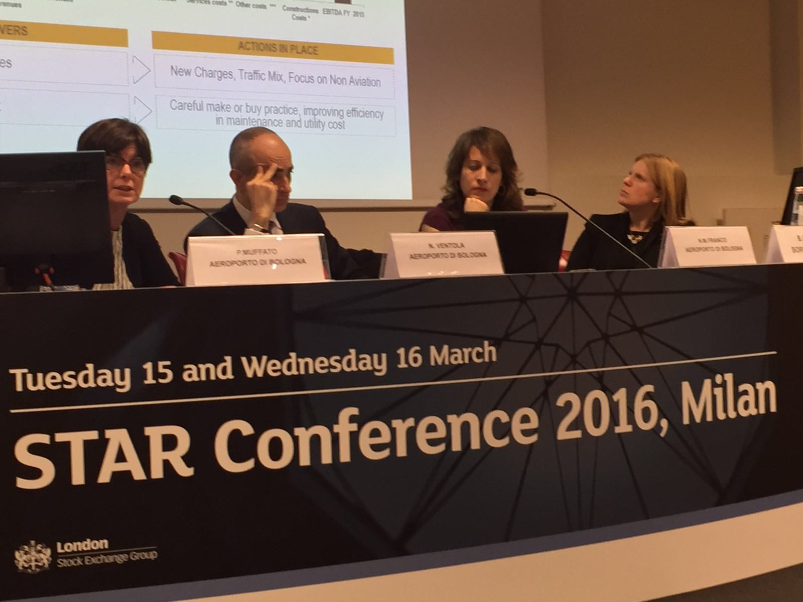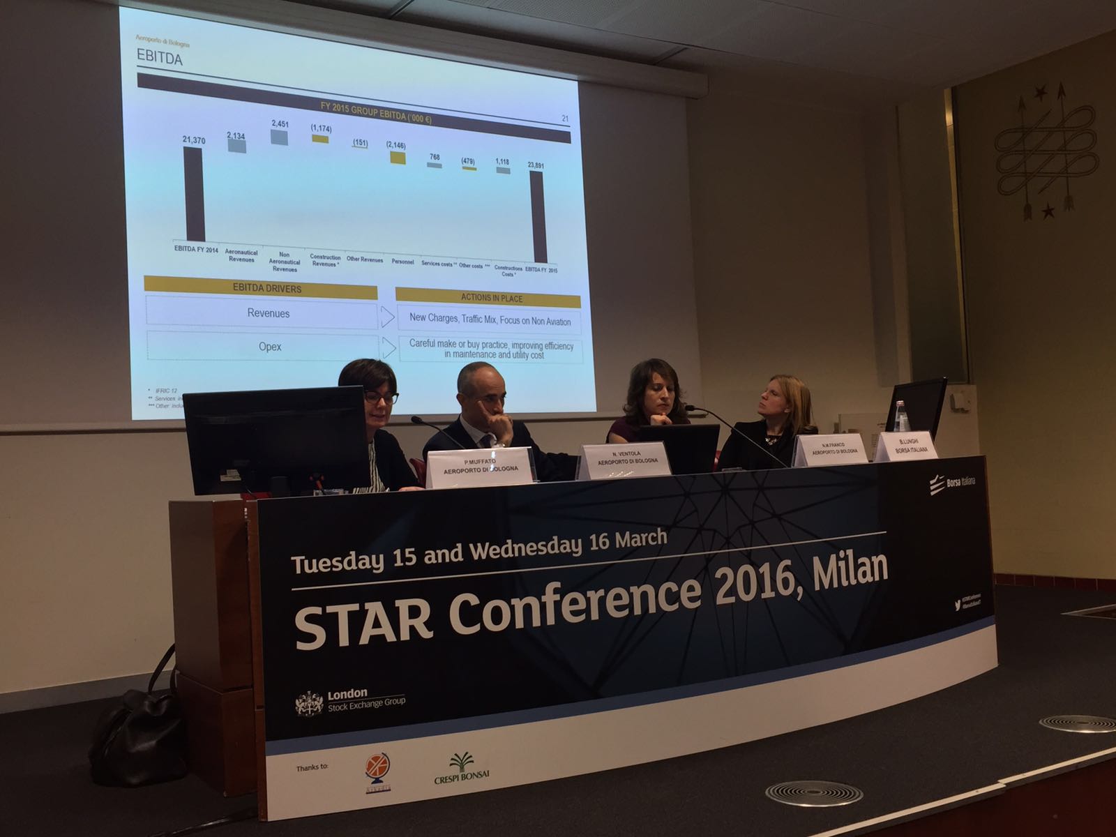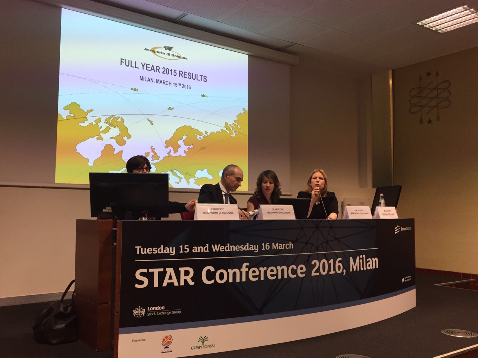 Tre immagini che testimoniano che stamani alla STAR Conference 2016 di Borsa Italiana, era anche presente l’Aeroporto di Bologna dove ha illustrato il Progetto del Bilancio 2015 approvato ieri dal suo CdA.
