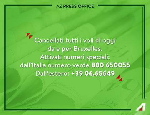 A seguito delle esplosioni verificatesi a Bruxelles, cancellati tutti i voli odierni da e per la capitale del Belgio. L’aeroporto resterà chiuso fino a nuove indicazioni.
