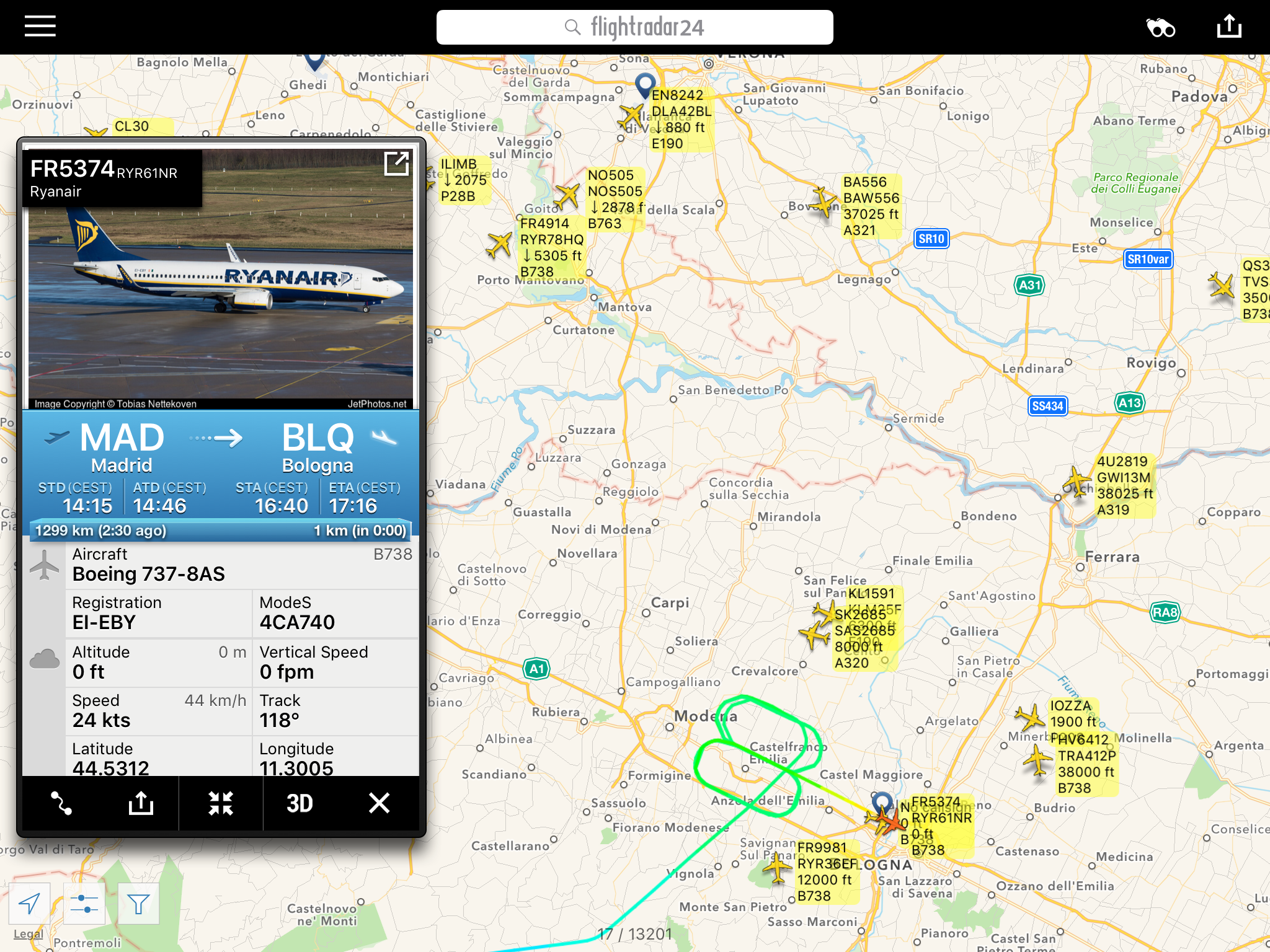 Le svariate holding di attesa prima di poter iniziare e completare con successo l’avvicinamento per questo volo Ryanair 5374 da Madrid. A Bologna il tempo nell’ultima ora ha visto il passaggio di un pesante fronte temporalesco.