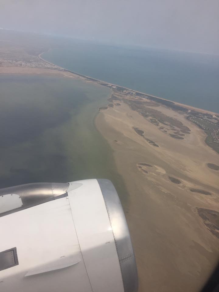 Quì sorvoliamo lo stagno del Sakhet Arina dove sostano di norma i flamingos, i fenicotteri rosa. intanto abbiamo virato a destra e poi un po’ a sinistra. Sullo sfondo si vede Gammarth e la linea di alberghi, nella maggior parte realizzati tra gli anni 70 ed 80. Le prime località turistiche della Tunisia.