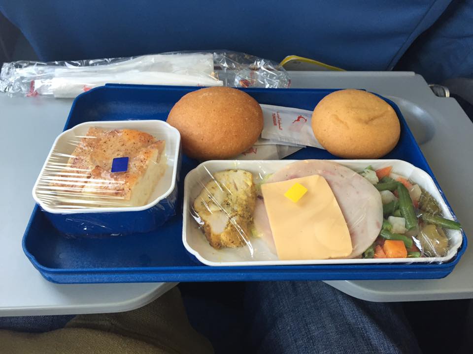 Tunisair serve ai propri passeggeri, stiamo volando in economica, un vassoietto con due portate fredde composte da un misto di carne e verdure ed un dolce. La carne è pollo con verdure cotte e formaggio. Uno strudel di mele per il dolce. Il tutto di qualità più che sufficiente. E’ un volo di poco meno di 80 minuti, con molte altre compagnie forse si riceve un salatino ed una bibita.