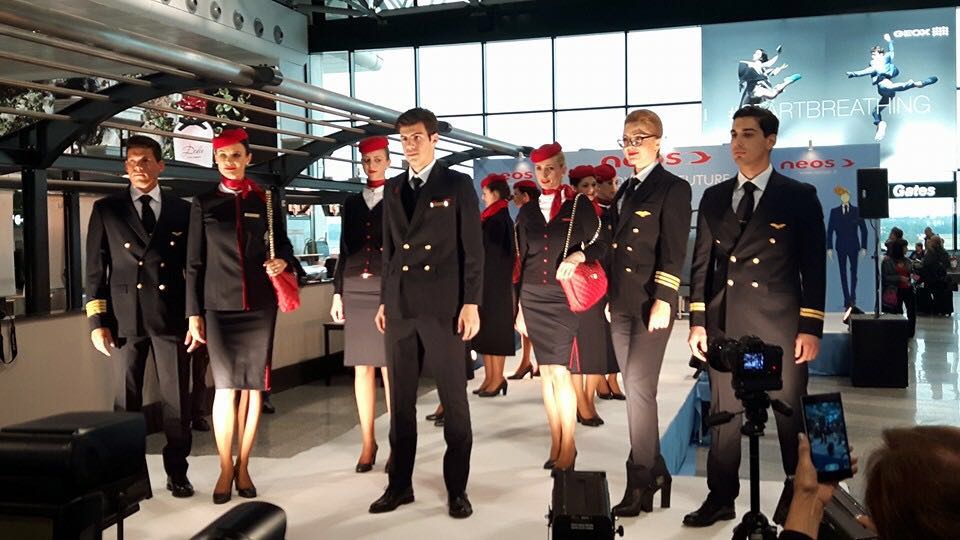 Nella foto dell’Ufficio Stampa SEA @SEA_press ci sono le nuove divise di Neos presentate a Milano Malpensa quest’oggi.