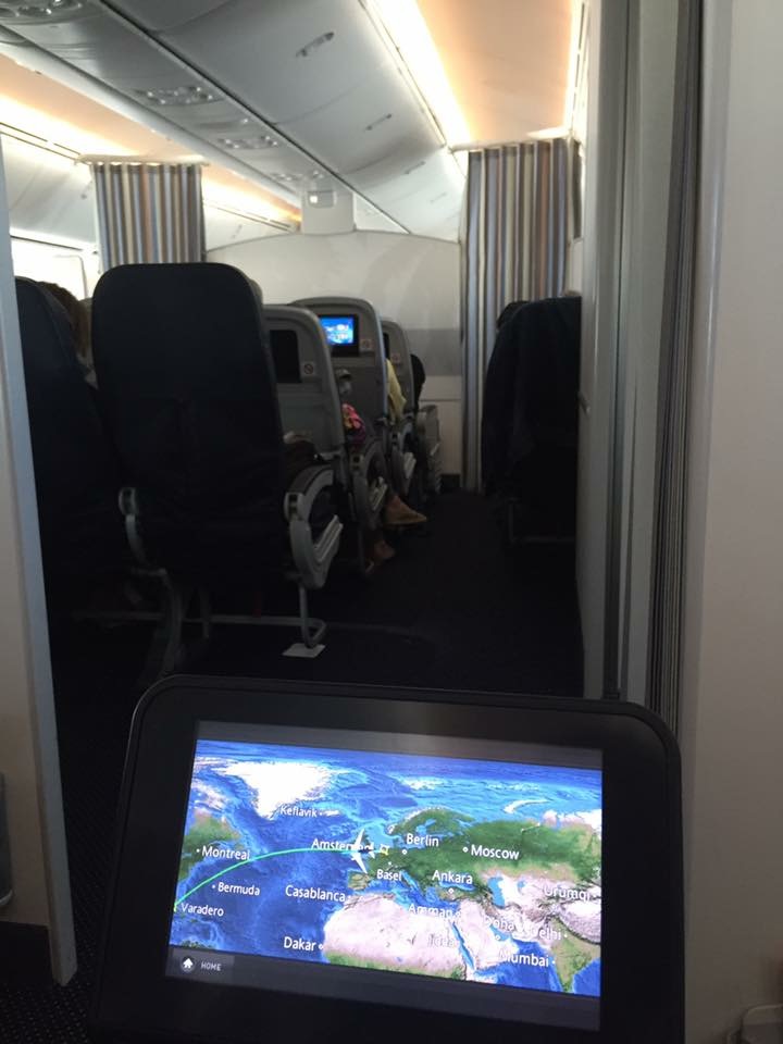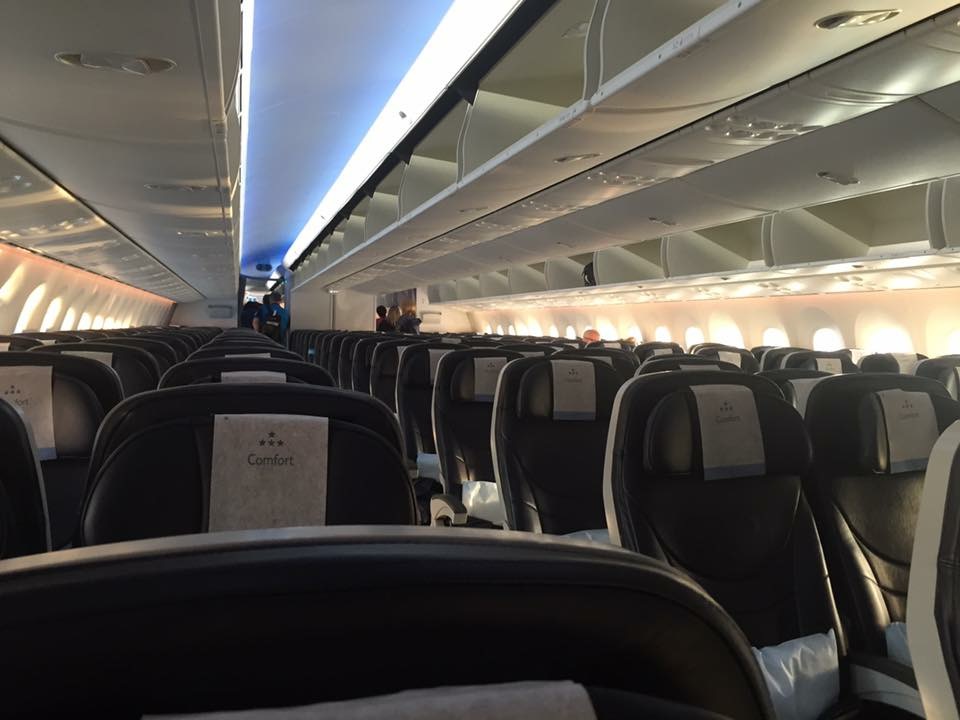 Ed ecco l’interno dell’aereo. C’e’ una specie di business class con tre file da sette posti, poltrone reclinabili, ma non lieflat o angle-flat