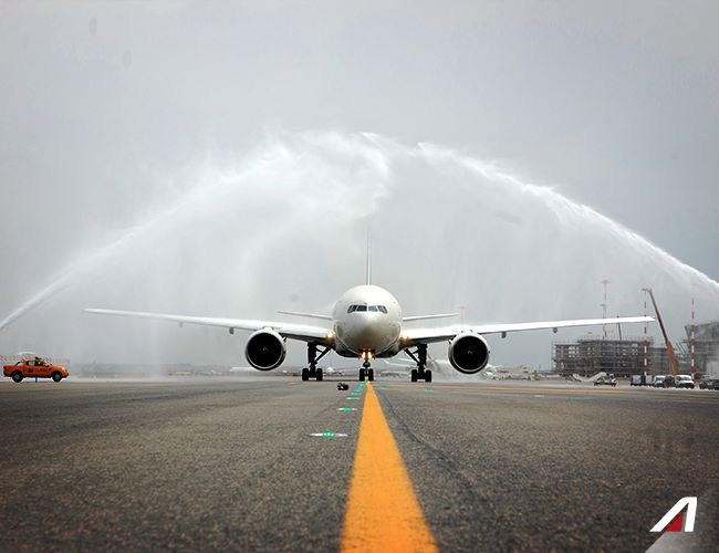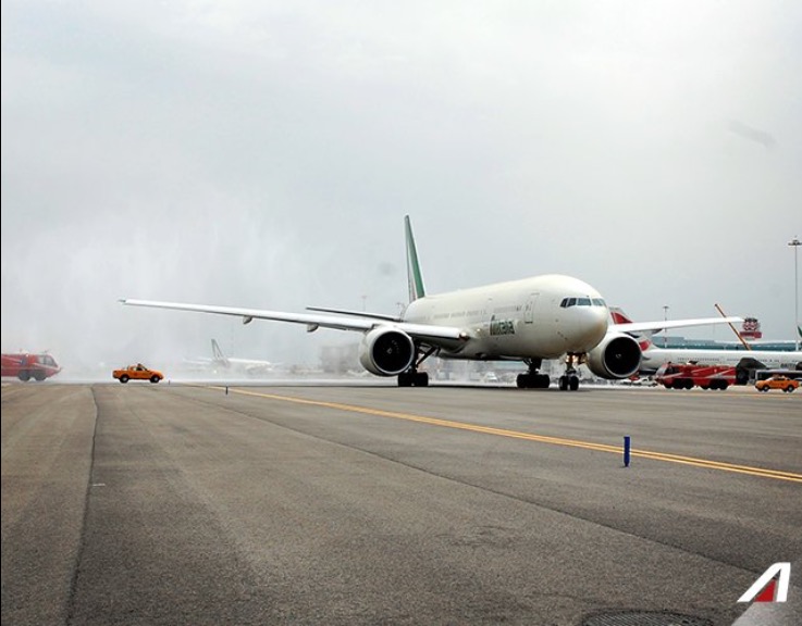 Il Boeing 777-243ER EI-DBL sta volando in mezzo all’Atlantico verso Mexico City. La prima immagine e’ quella del water cannon salute in una grigia mattinata di Fiumicino a celebrare la buona nuova dell’inizio del collegamento per Mexico City!
