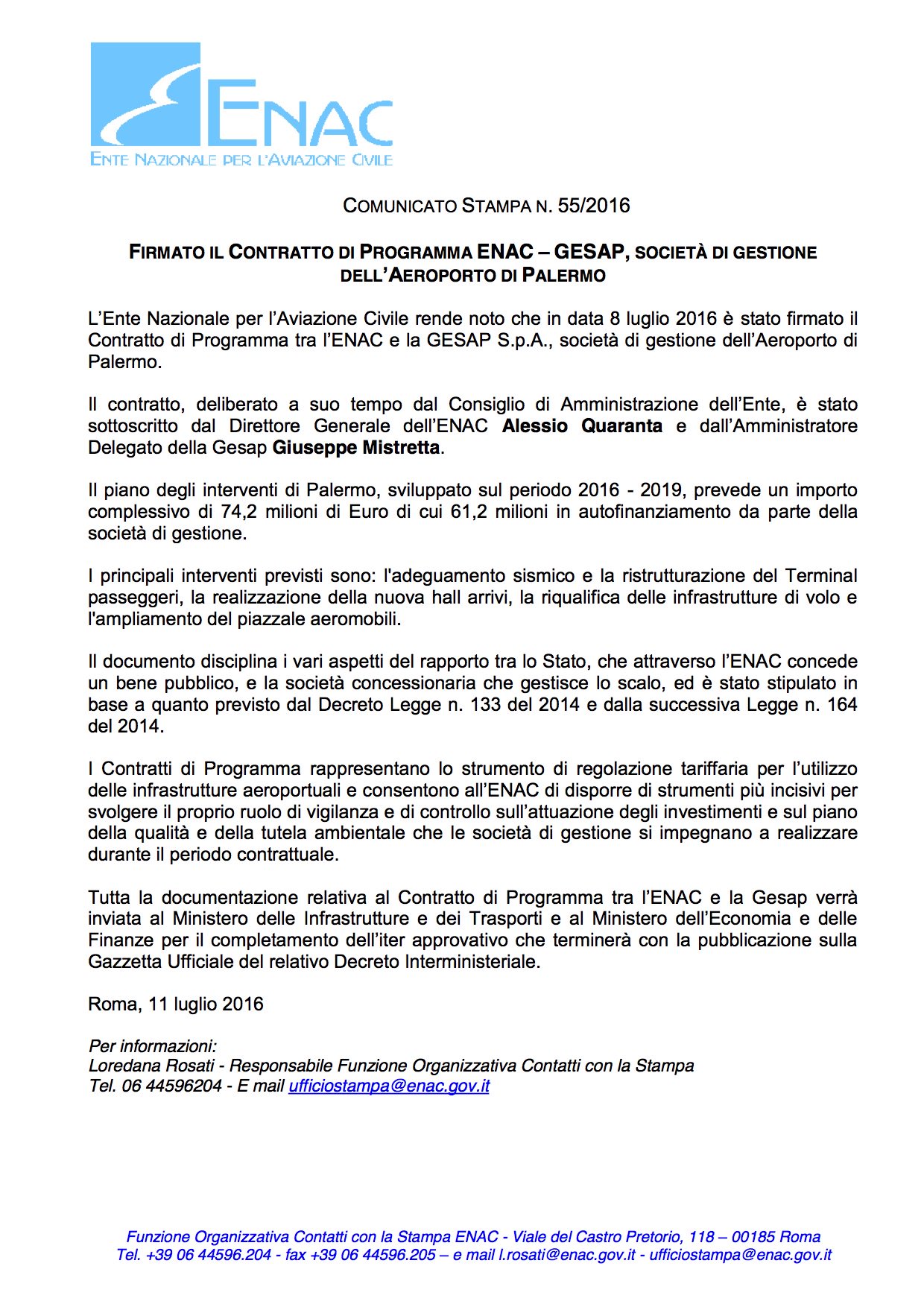 Il nuovo accordo siglato da ENAC ed il gestore dell’aeroporto di Palermo GESAP è tra il 2016 ed il 2019 dove ci saranno interventi per oltre 74 milioni di € in buona parte in autofinanziamento.