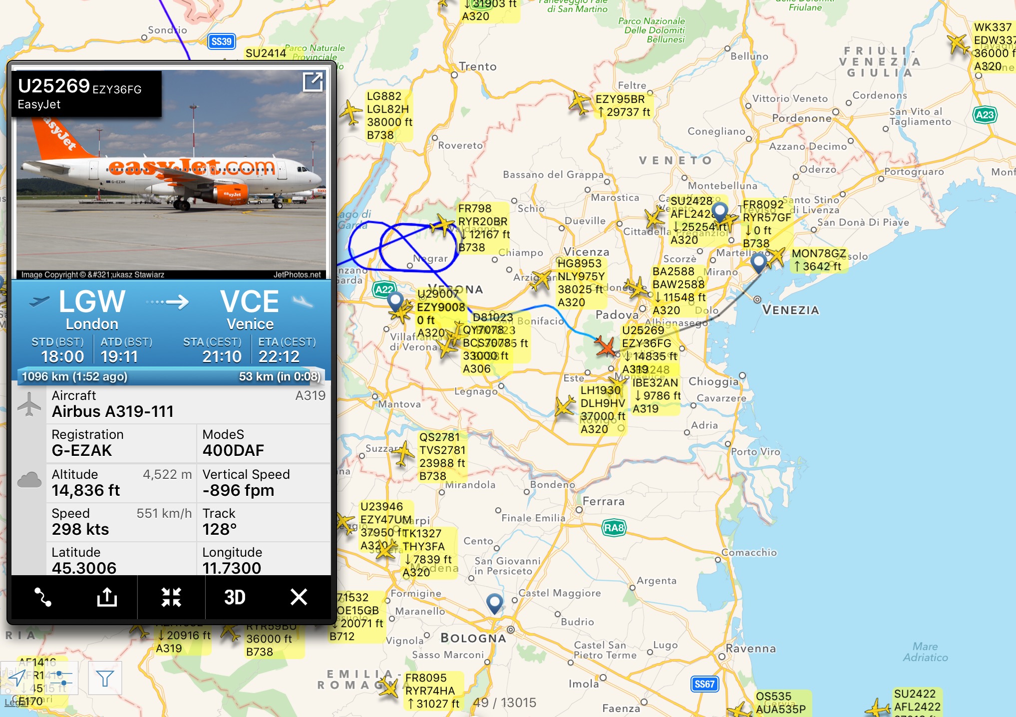 Si vedono i segmenti inusuali di questo volo easyJet ma anche di altri come un Aeroflot visibile in basso a sinistra da Mosca per Venezia che ha circumnavigato il nocciolo da sud, puntando verso Bologna, poi verso nord est.