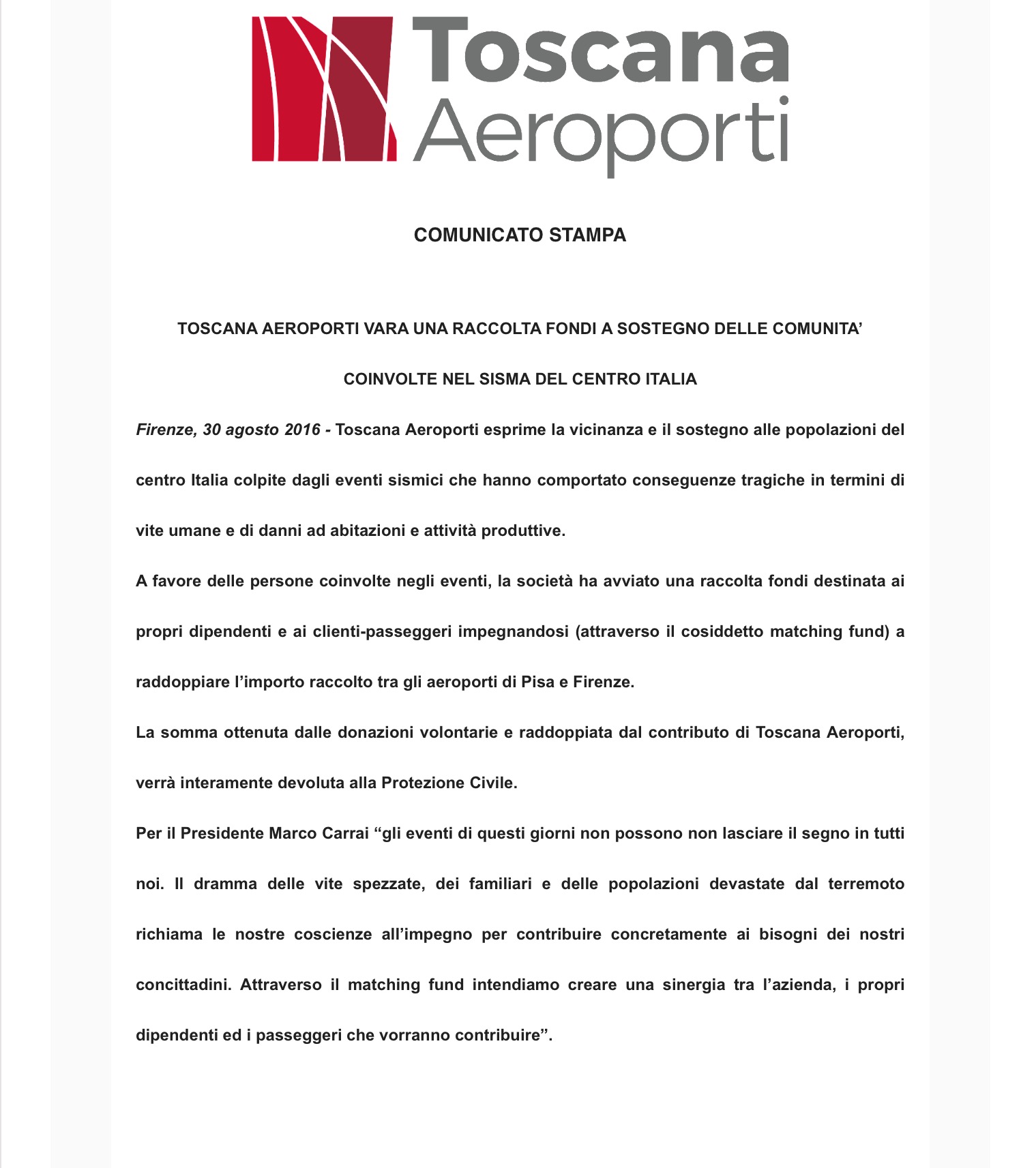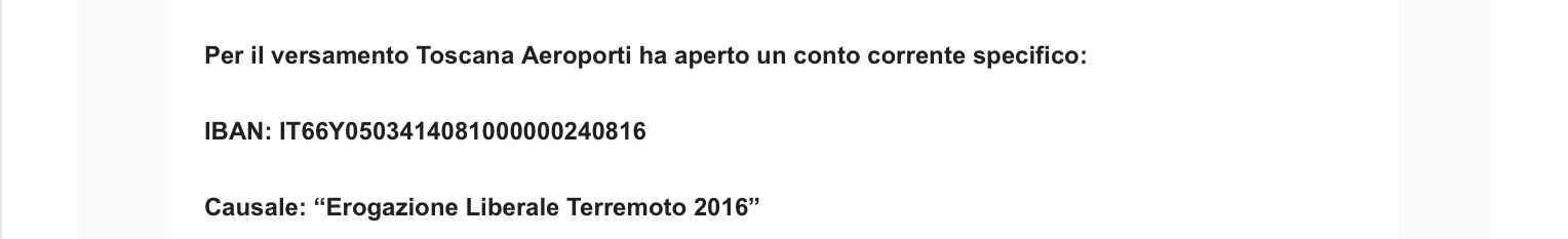 aeroporti #Toscanaaeroporti raccoglie denaro per i terremotati Pubblicato da Italiavola il 31 agosto 2016 #italiavolanews Anche la società che gestisce gli #aeroporti di #Firenze e #Pisa sposa la causa delle #donazioni per i #terremotati favorendole con l’apertura di un conto corrente bancario. Condividi: Fai clic per condividere su Facebook (Si apre in una nuova finestra) Facebook Fai clic qui per condividere su LinkedIn (Si apre in una nuova finestra) LinkedIn Fai clic qui per condividere su Reddit (Si apre in una nuova finestra) Reddit Fai clic qui per condividere su Pinterest (Si apre in una nuova finestra) Pinterest Fai clic qui per condividere su Tumblr (Si apre in una nuova finestra) Tumblr Fai clic per condividere su X (Si apre in una nuova finestra) X Mi piace Caricamento... Correlati