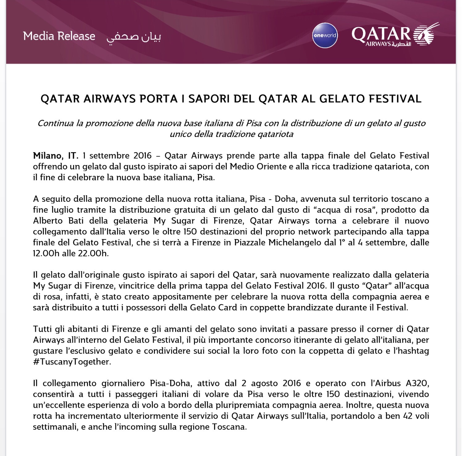 Al Gelato Festival fino a domenica 4 sara’ possibile degustare la straordinaria fragranza all’acqua di rosa. Un sapore arabo che Qatar Airways vuole utilizzare come strumento promozionale per spingere il suo nuovo collegamento aereo tra #Doha e #Pisa.