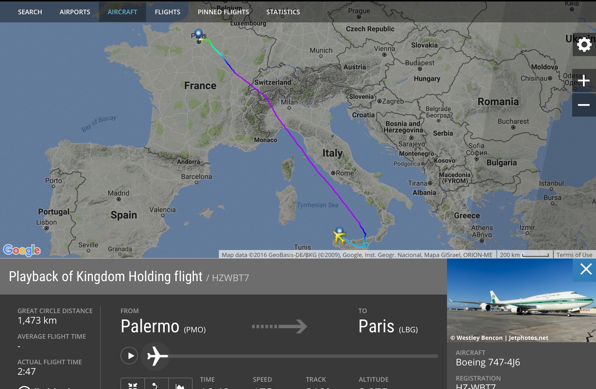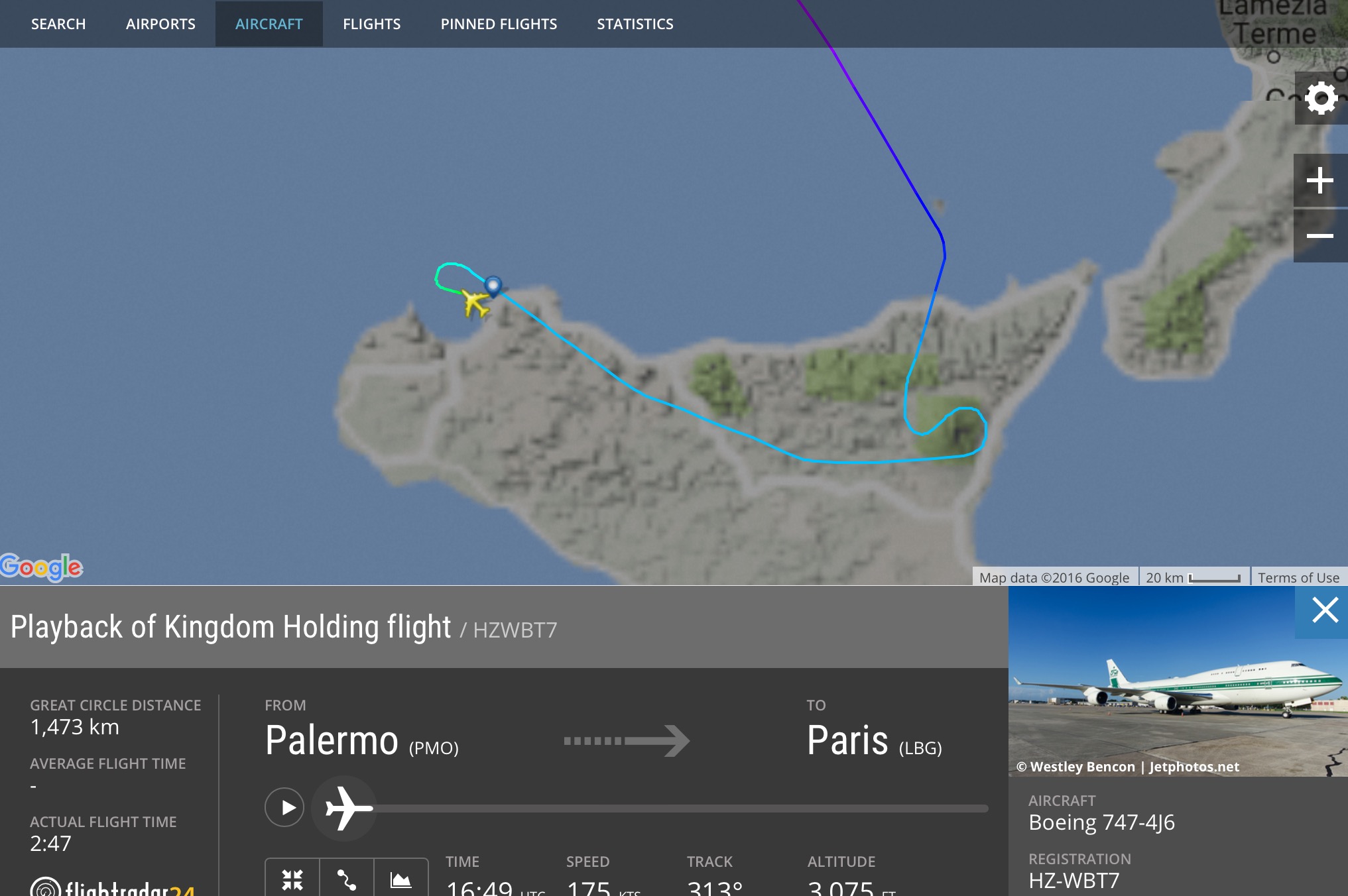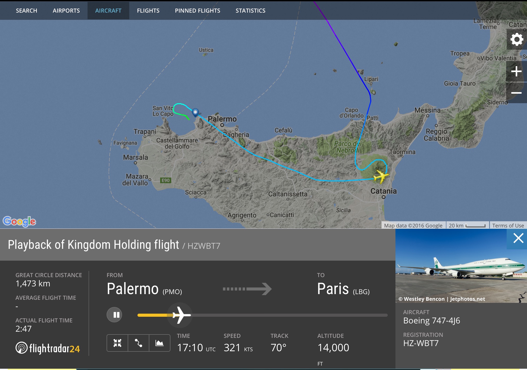 Il #fascino del #vulcano #Etna per il Principe Saudita ha colpito. Dopo il decollo avvenuto nel tardo pomeriggio di oggi da Palermo il Boeing 747-4J6 VIP HZ-WBT7 della Kingdom Holding ha messo prua verso Catania e sfruttando la bella serata ha navigato attorno al vulcano al livello di volo 140. Dopo aver effettuato quasi un giro completo ha messo poi la prua verso Parigi Le Bourget.