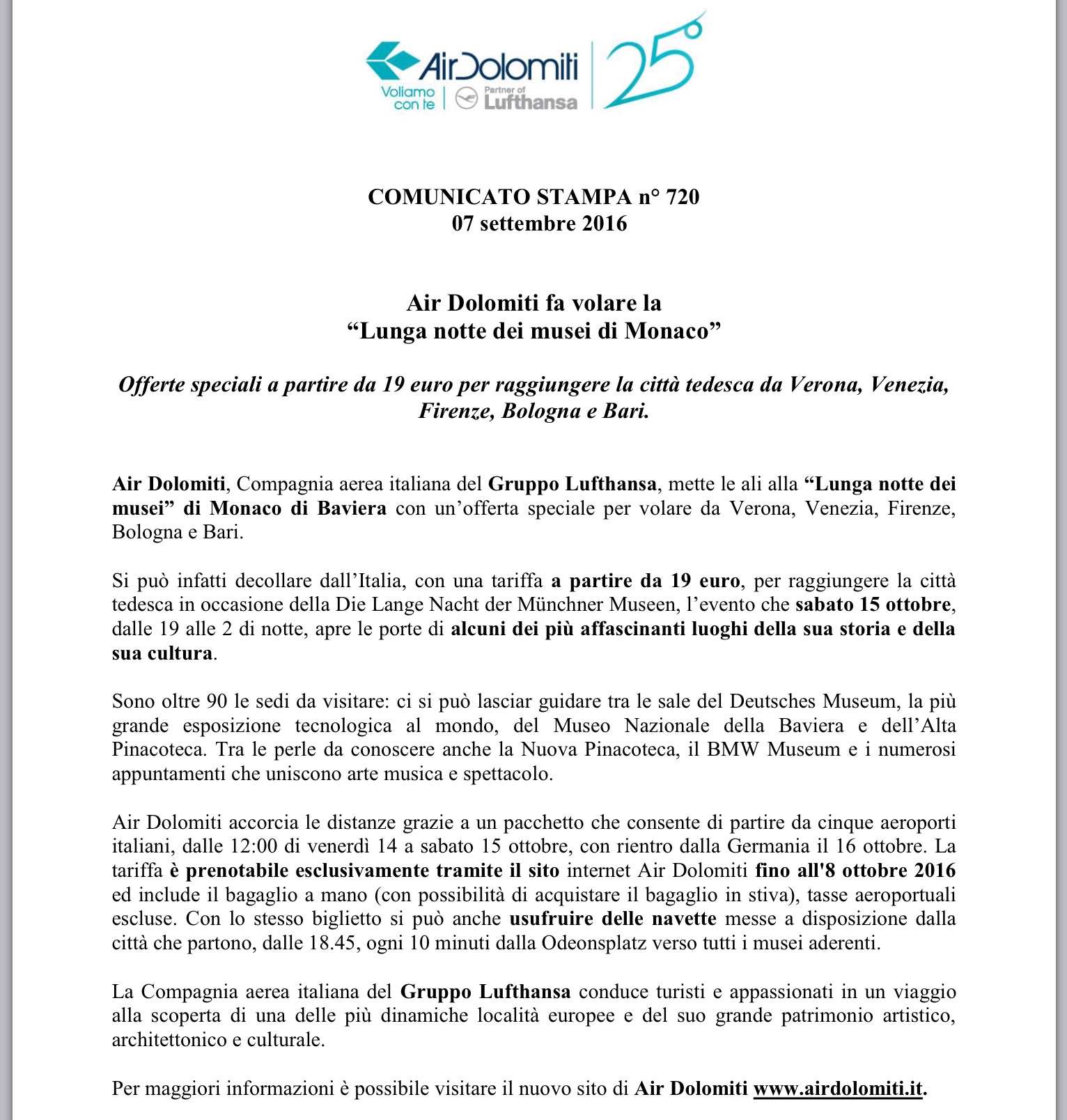 Nel weekend tra il 14 ed il 16 ottobre approfitta della manifestazione #LunganottedeimuseidiMonaco”. Parti dalle 12 di venerdì 14/10 fino a sabato, ritorna il 16 ottobre. Se lo farai da #Bologna, #Bari, #Firenze, #Verona e #Venezia potrai volare a partire da 19€ one way. Acquisti fino al 6/10 solo sul sito internet http://www.airdolomiti.it