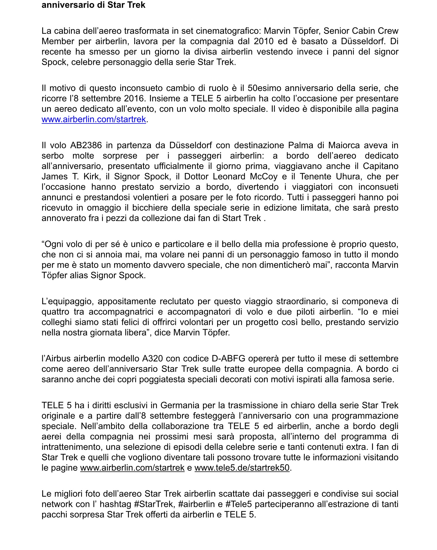 compagnie aeree @airberlin e #Tele5 per #StarTrek Pubblicato da Italiavola il 8 settembre 20169 settembre 2016 #Italiavolanews #airberlin trasporta #StarTrek nel mese di settembre sulla fusoliera di un A320 Condividi: Fai clic per condividere su Facebook (Si apre in una nuova finestra) Facebook Fai clic qui per condividere su LinkedIn (Si apre in una nuova finestra) LinkedIn Fai clic qui per condividere su Reddit (Si apre in una nuova finestra) Reddit Fai clic qui per condividere su Pinterest (Si apre in una nuova finestra) Pinterest Fai clic qui per condividere su Tumblr (Si apre in una nuova finestra) Tumblr Fai clic per condividere su X (Si apre in una nuova finestra) X Mi piace Caricamento... Correlati