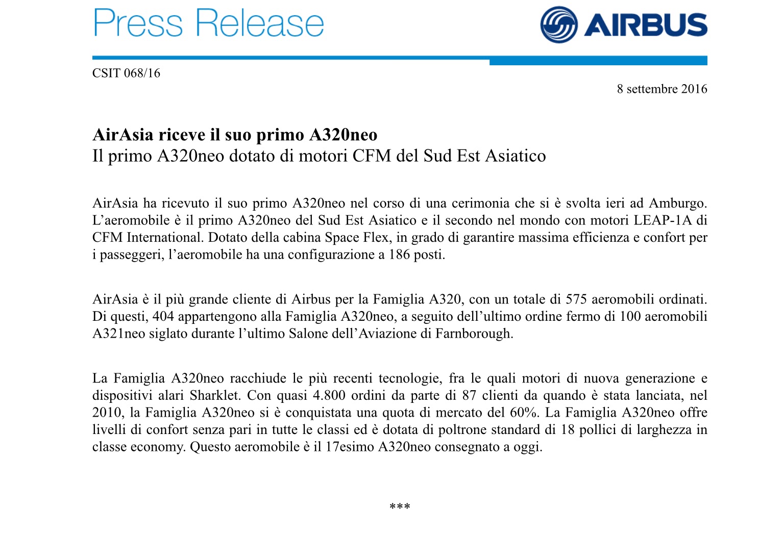Airbus annuncia la consegna del primo A320neo a #AirAsia.