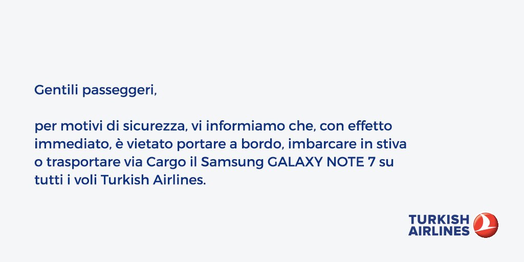 compagnie aeree Turkish Airlines vieta il trasporto di Samsung Galaxy Note 7 Pubblicato da Italiavola il 24 ottobre 2016 Anche #TurkishAirlines vieta il trasporto del Samsung Galxy Note 7 sia a bordo che nel compartimento cargo. #SamsungGalaxyNote7 #NOSamsungGalaxyNote7onboard Condividi: Fai clic per condividere su Facebook (Si apre in una nuova finestra) Facebook Fai clic qui per condividere su LinkedIn (Si apre in una nuova finestra) LinkedIn Fai clic qui per condividere su Reddit (Si apre in una nuova finestra) Reddit Fai clic qui per condividere su Pinterest (Si apre in una nuova finestra) Pinterest Fai clic qui per condividere su Tumblr (Si apre in una nuova finestra) Tumblr Fai clic per condividere su X (Si apre in una nuova finestra) X Mi piace Caricamento... Correlati