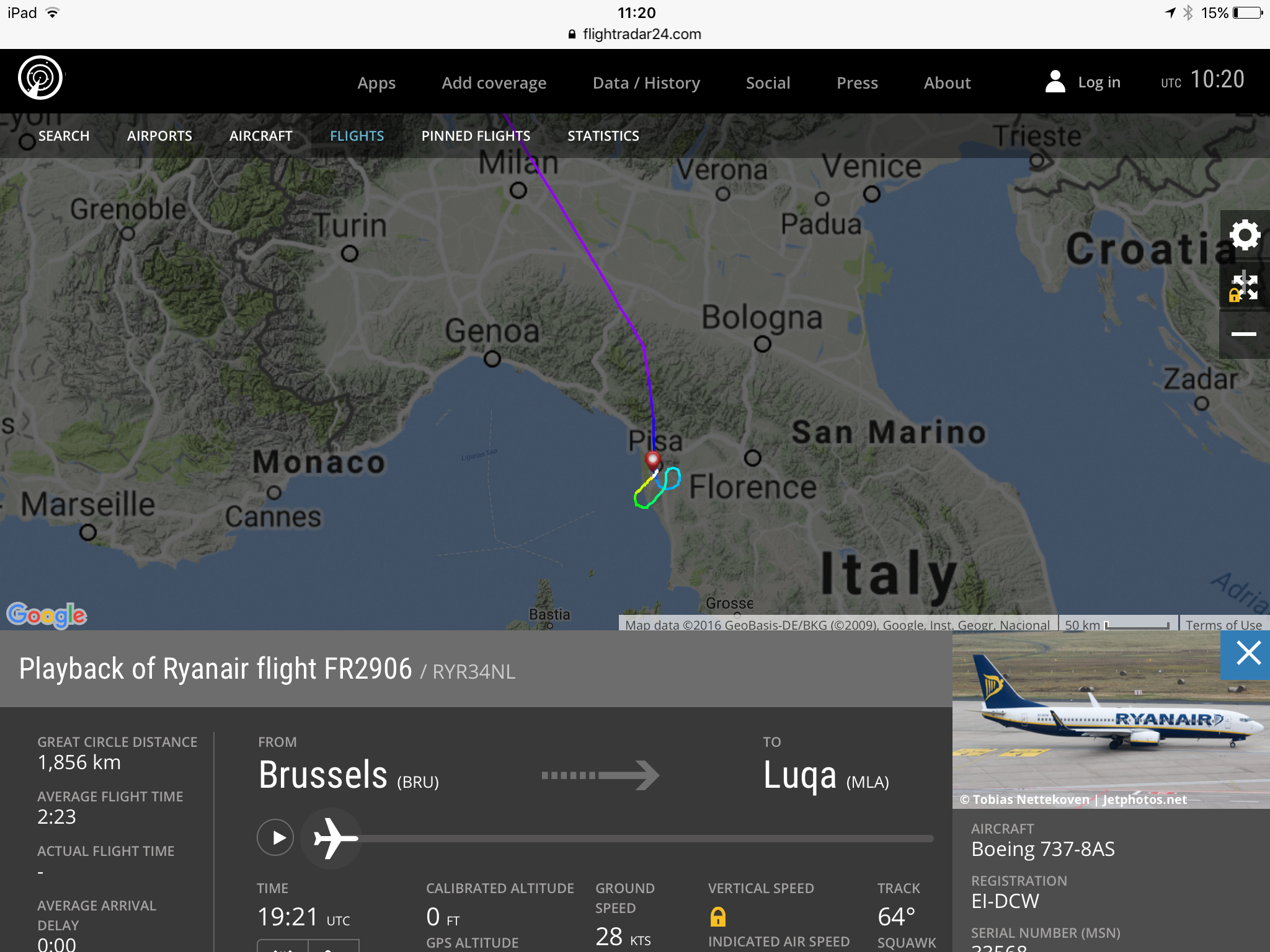 L’aereo B737/800 EI-DCW come si vede dal diagramma ha iniziato a perdere quota sull’Appennino poi ha compiuto un paio di holding per perdere ulteriore quota ed atterrare nel più breve tempo possibile. Il volo FR2906 ha posato le ruote a Pisa alle 21:53.