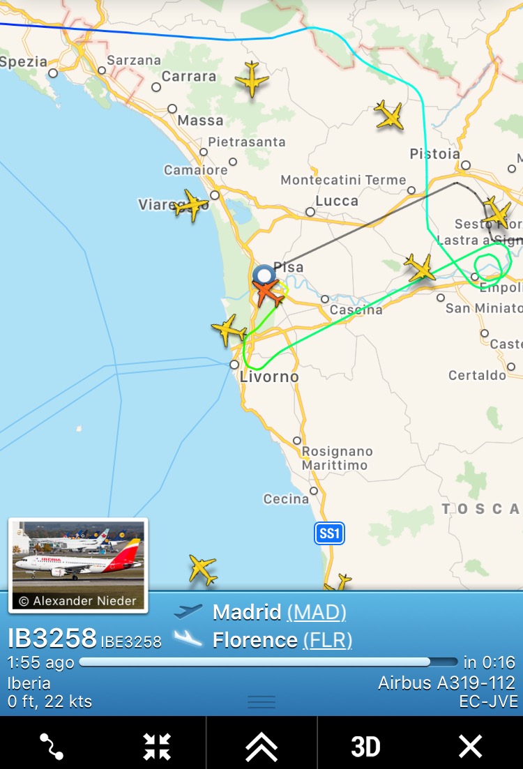 Nell’immagine il percorso di questo A319/100 Iberia EC-JVE che dopo alcune orbite si e’ recato a Firenze.