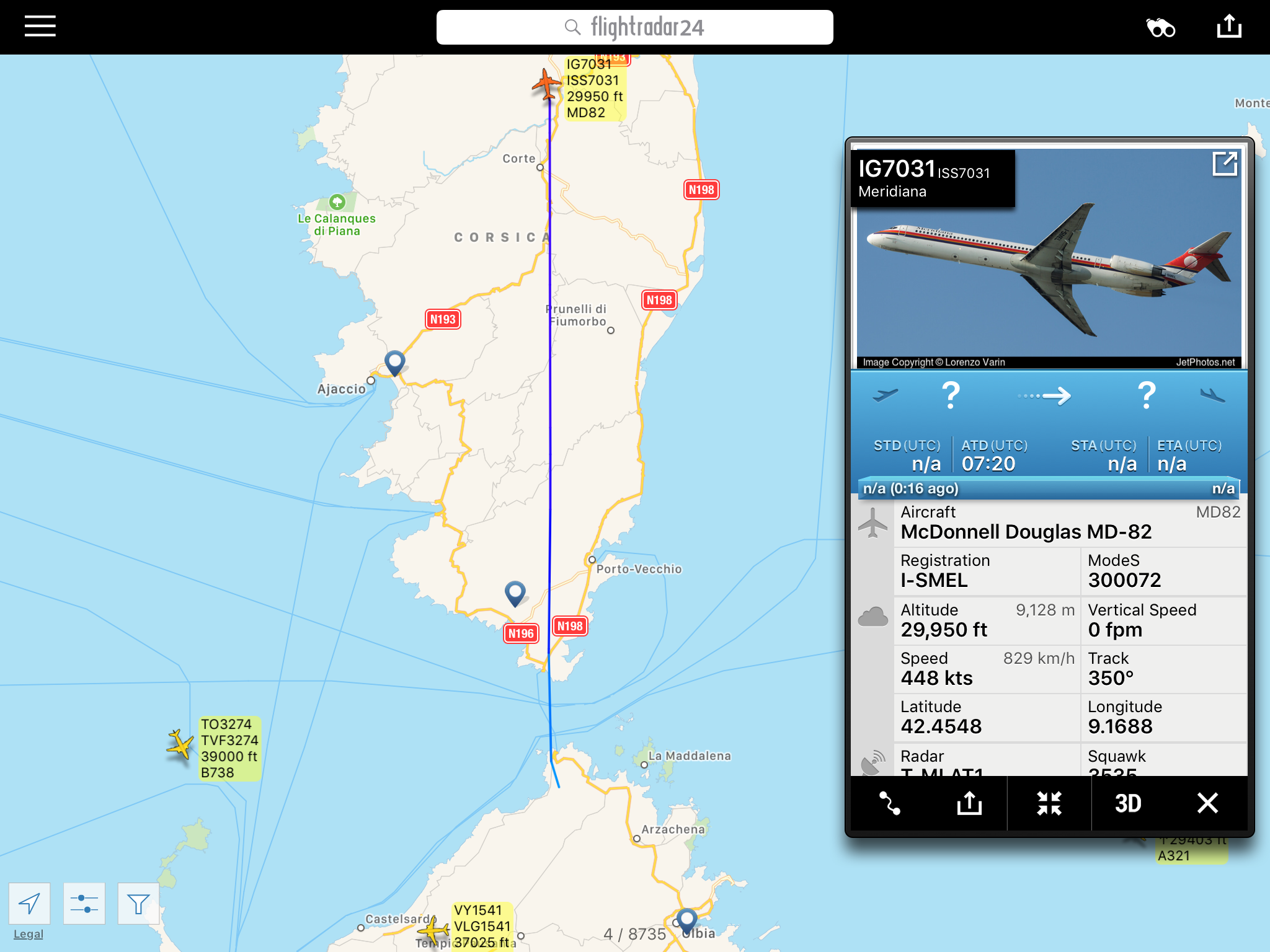 Eccolo e’ sulla Corsica il MD82 I-SMEL della Meridiana nel suo ultimo volo verso Milano Malpensa. È IG7031 il numero di volo attribuito a questo live di trasferimento per il suo futuro, cioè entrare nella collezione di mezzi volanti di Volandia.