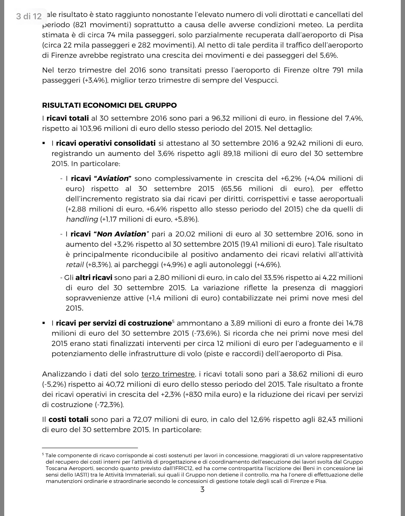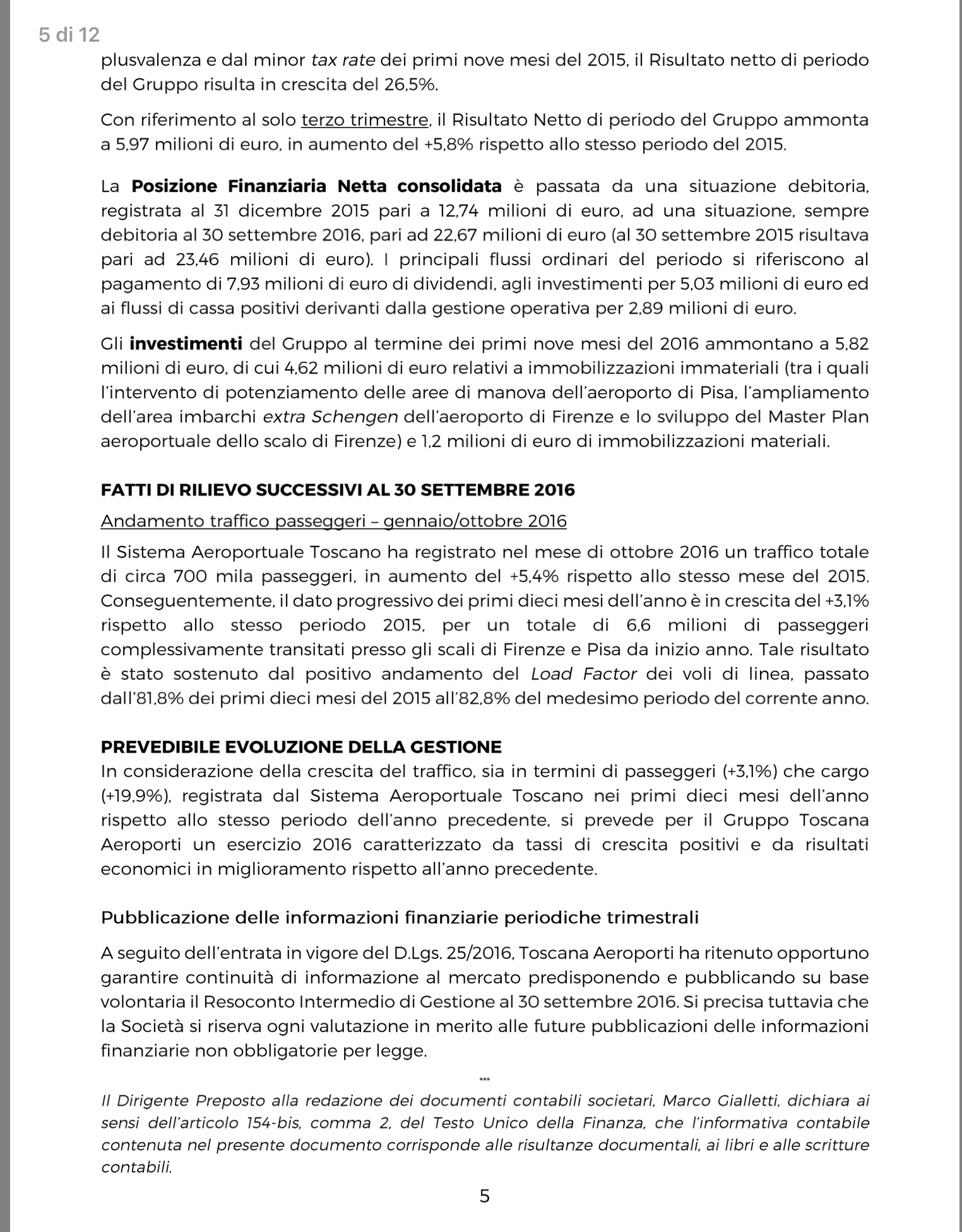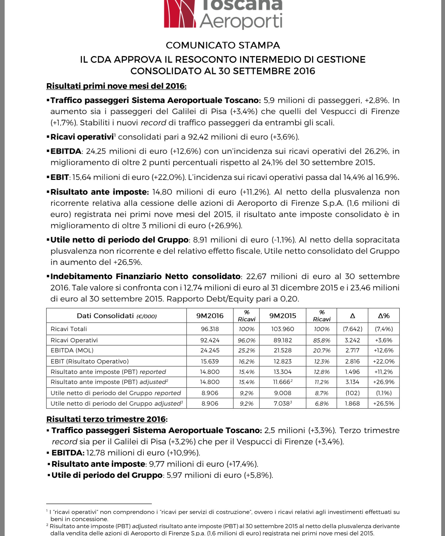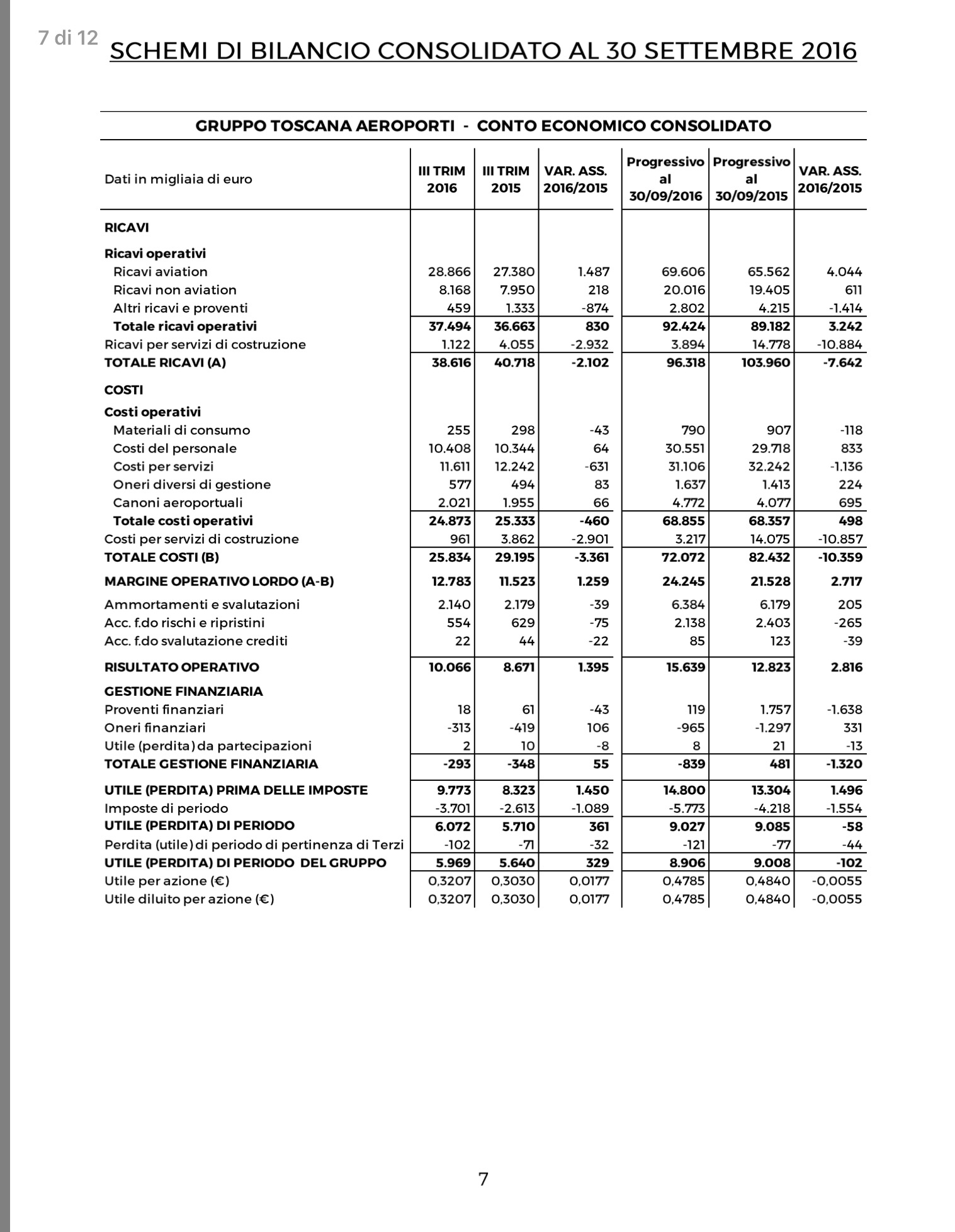 aeroporti Terza trimestrale 2016 per Toscana Aeroporti. Utili e fatturato in calo Pubblicato da Italiavola il 14 novembre 2016 Qui a seguire il comunicato stampa ed i resoconti economici del terzo trimestre di Toscana Aeroporti, la società che gestisce gli aeroporti di Pisa e Firenze. Condividi: Fai clic per condividere su Facebook (Si apre in una nuova finestra) Facebook Fai clic qui per condividere su LinkedIn (Si apre in una nuova finestra) LinkedIn Fai clic qui per condividere su Reddit (Si apre in una nuova finestra) Reddit Fai clic qui per condividere su Pinterest (Si apre in una nuova finestra) Pinterest Fai clic qui per condividere su Tumblr (Si apre in una nuova finestra) Tumblr Fai clic per condividere su X (Si apre in una nuova finestra) X Mi piace Caricamento... Correlati