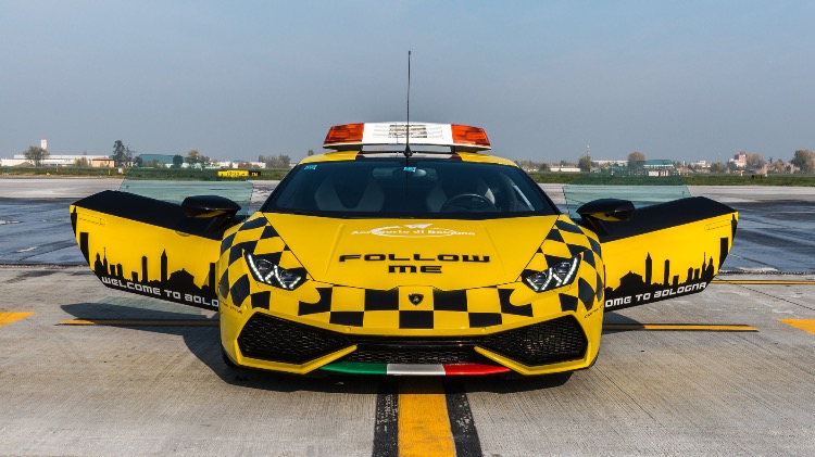 La Huracán Follow Me, supersportiva dal motore V10 aspirato e da 610 CV, è caratterizzata da una speciale livrea disegnata dal Centro Stile Lamborghini a quadretti neri su carrozzeria gialla, e inaugura la nuova livrea che sarà prevista per i mezzi operativi che si muovono nelle aree di manovra degli aeromobili. Completano gli esterni una grafica che raffigura lo skyline della città di Bologna sulle portiere e il tricolore sullo spoiler anteriore. La vettura è inoltre dotata dell’allestimento tipico dei mezzi “Follow Me”: barra segnaletica sul tetto, lampeggianti di segnalazione e radio collegata con la Torre di Controllo.