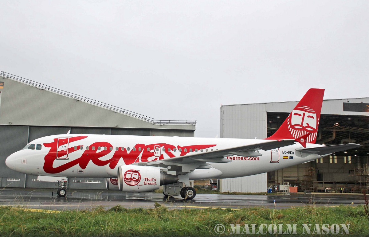 Si tratta di un Airbus A319, con la scritta “Ernest” rossa sulla fiancata bianca, mentre la coda è rossa con il volto stilizzato simbolo di Ernest, che campeggia anche sui motori laterali.