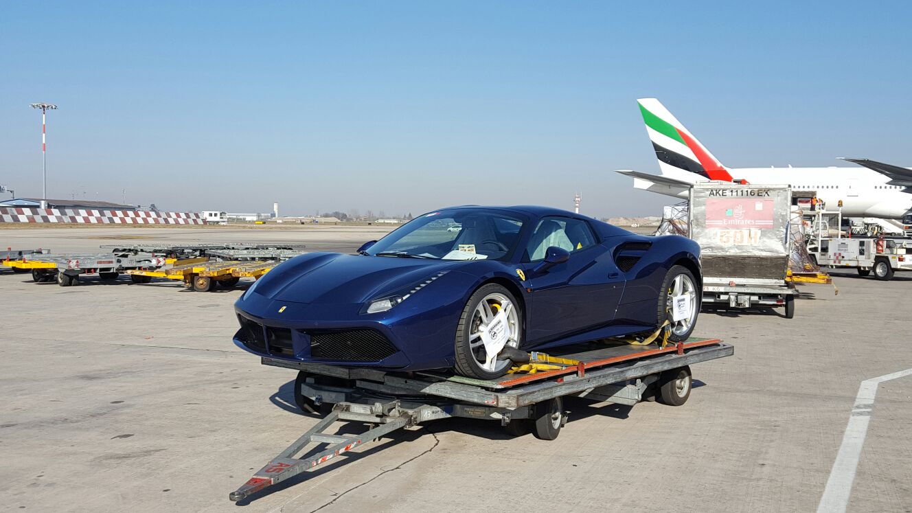 Questa e’ un immagine di oggi, una #Ferrari nuova che attende di essere caricati nella pancia del volo di linea #Emirates da #Bologna per #Dubai.
