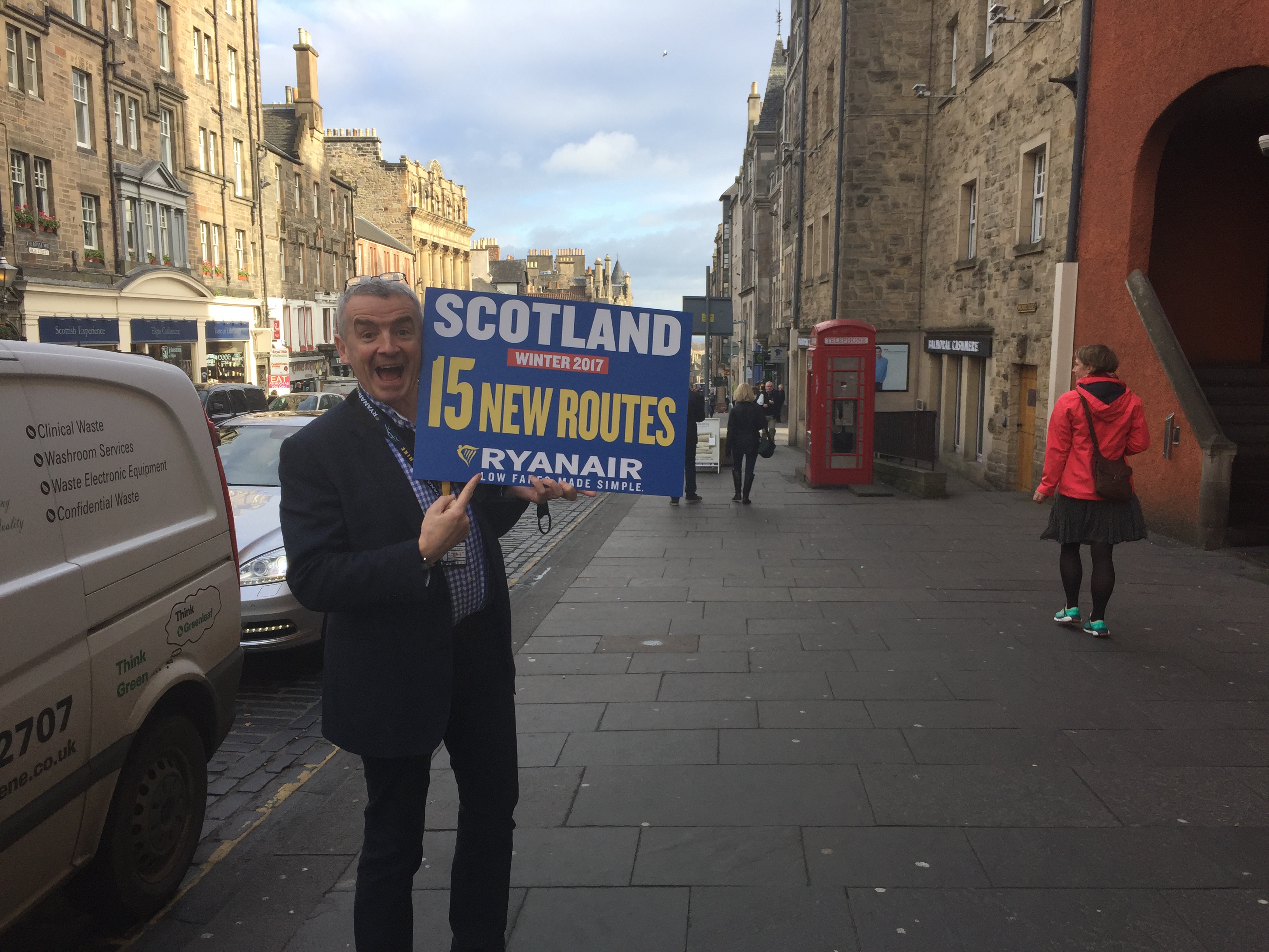 Oggi c’è stata grande attività in Scozia e nella foto si vede Michael O’Leary che con il cartello sulla strada promuove le sue novità della sua linea aerea.