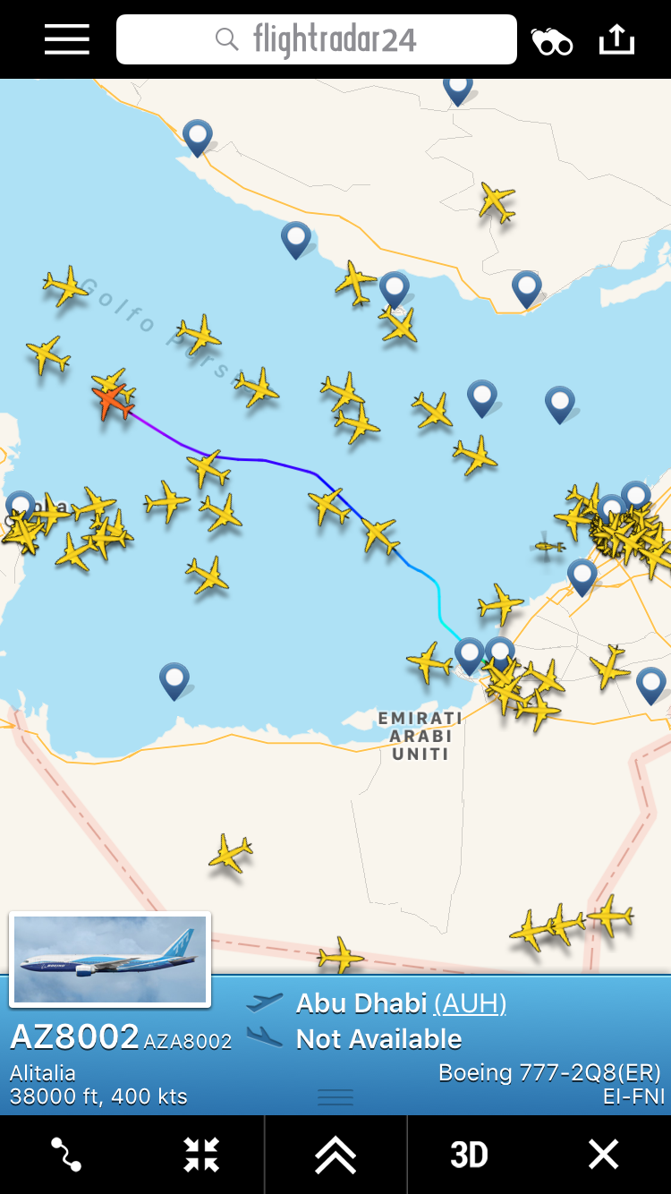 Il volo AZ8002 decollato da Abu Dhabi, lo screenshot lo riporta sul Golfo Persico, e’ quello assegnato a EI-FNI.