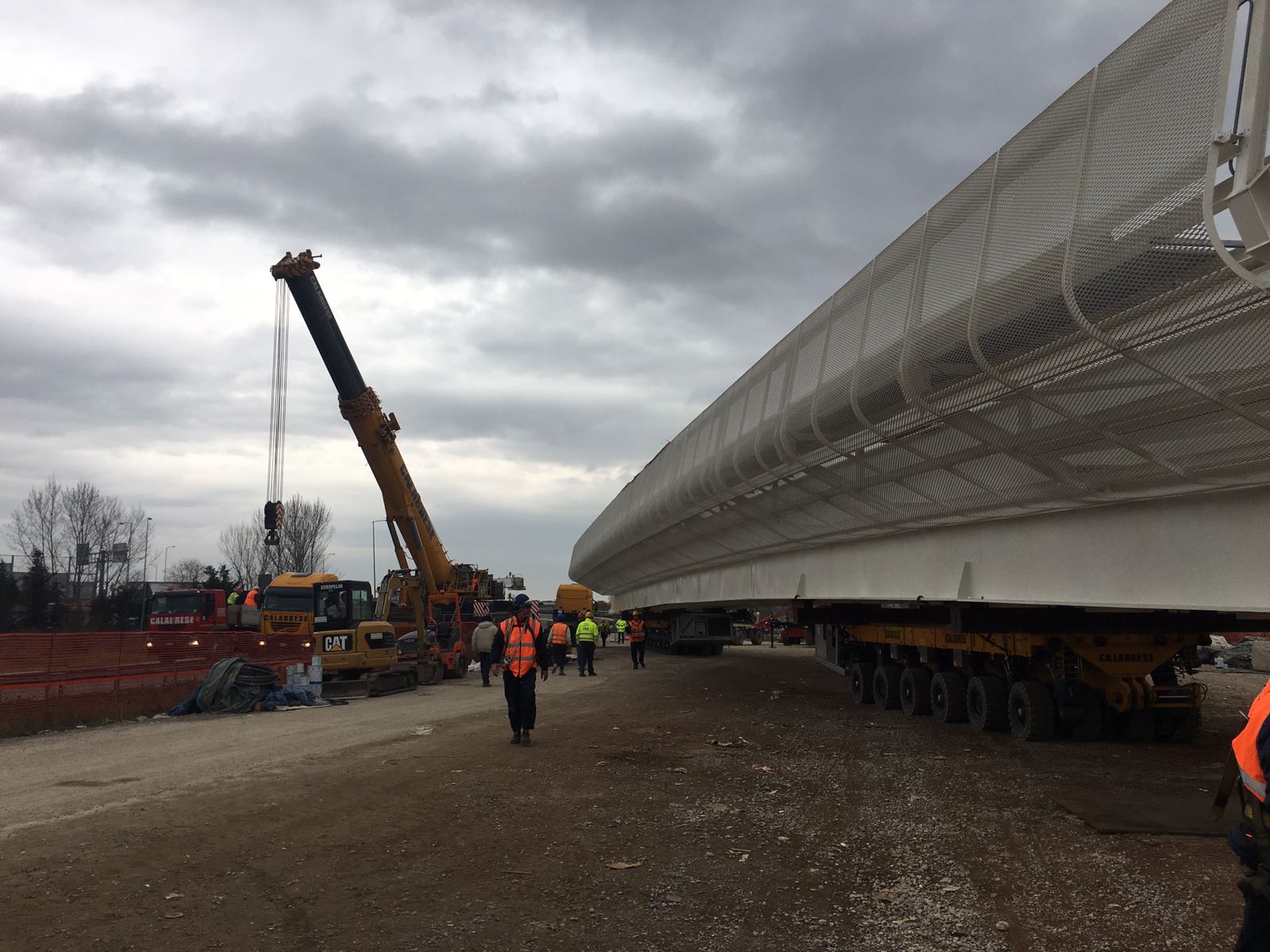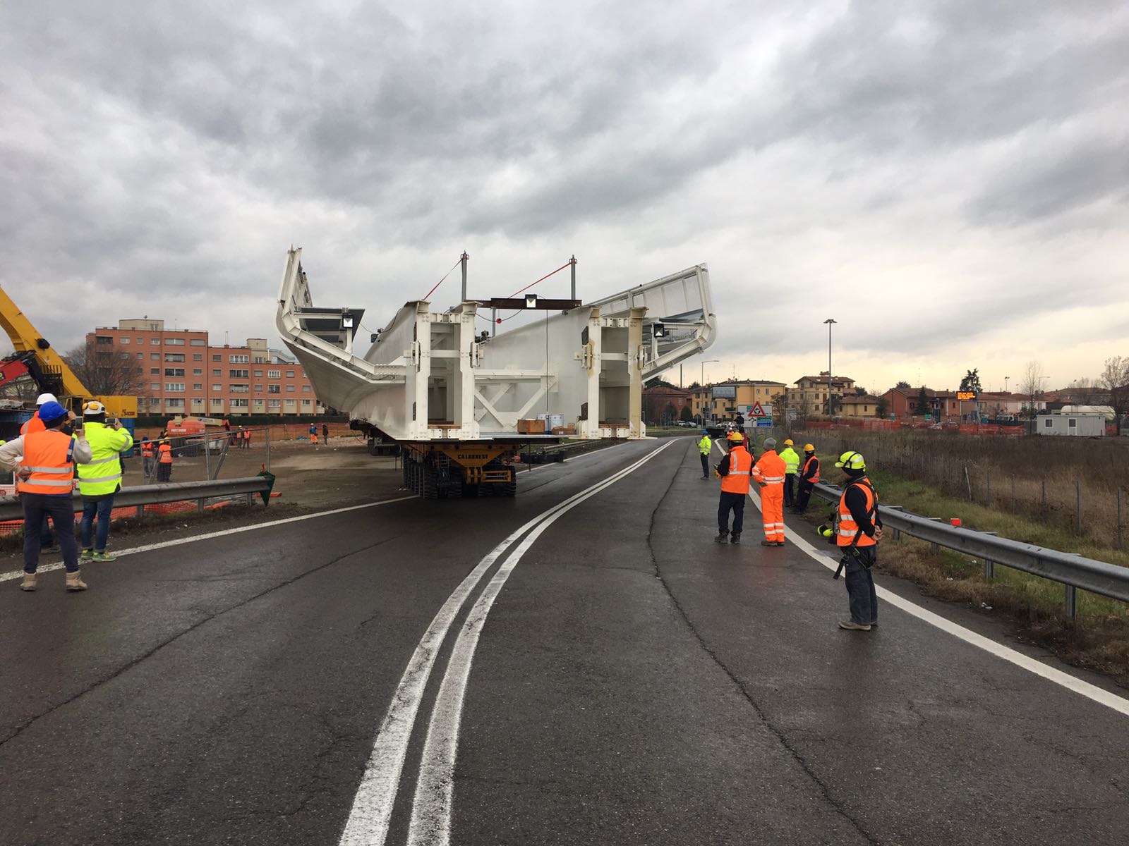 Ecco che la lunga campata lascia il cantiere poer percorrere l’uscita della tangenziale, al momento già chiusa. La carreggiata viene utilizzata come modo per poter posizionare la campata vicino alla tangenziale. Dalle 20, quando verrà chiusa, inizieranno le attività di installazione del componente, che andrà a completare il people mover.