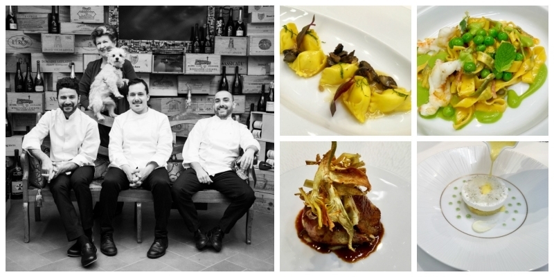La stessa filosofia è alla base del “Semifreddo di Gorgonzola dolce e baccelli”, dove i “baccelli” sono le fave, ingrediente tipicamente primaverile e assolutamente legato al territorio; così come i “Bocconcini di San Pietro al nero di seppia, spinaci novelli, salsa bernese e gelatina di camomilla al limone” che esaltano gli spinaci novelli e il “Piccione alla leccarda con composizione di carciofi” che presenta i carciofi, reperiti sempre da fornitori locali.