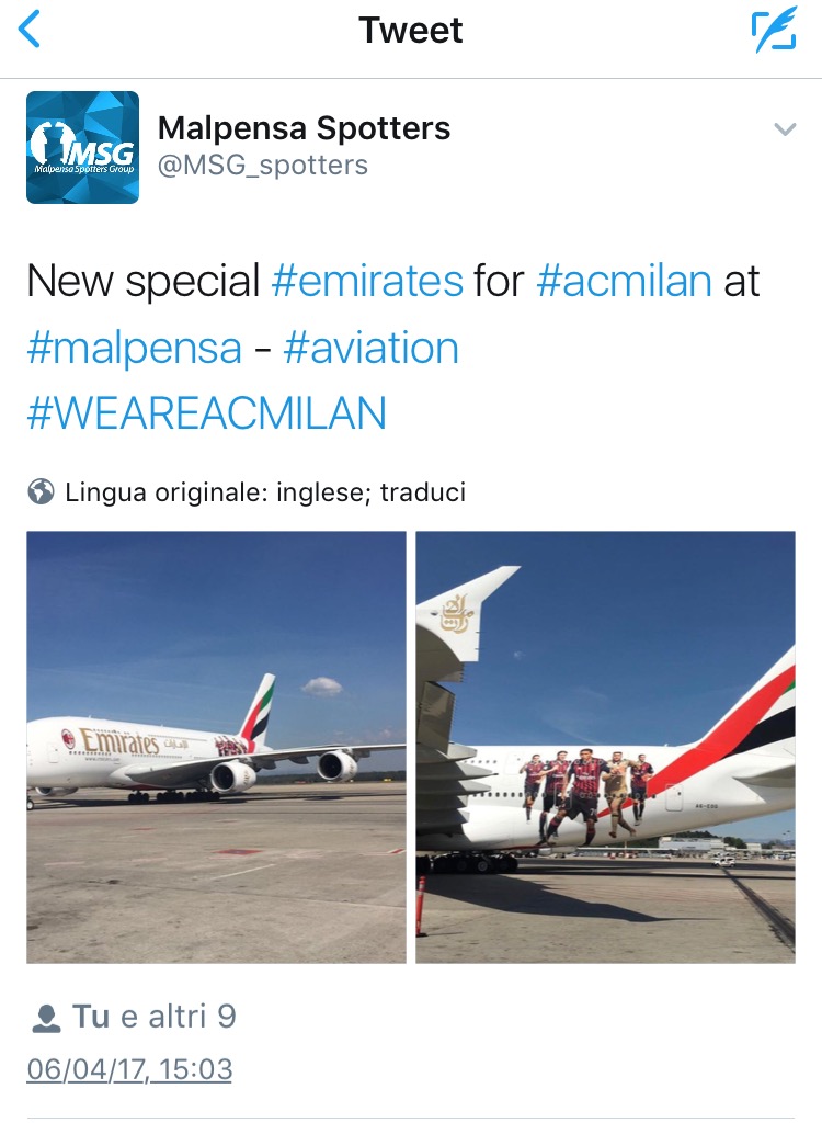 aeroporti, compagnie aeree, rotte Il nuovo AC Milan A380 a Malpensa Pubblicato da Italiavola il 6 aprile 2017 Oggi #MSGSpotters ha catturato questa primizia! Il A380-800 A6-EOG con la livrea del AC Milan! Qui lo screenshot del tweet lanciato in rete!ovviamente e’ stato immortalato a Milano Malpensa. #Emirates #Tweet #ACMilan #Milano #Malpensa Condividi: Fai clic per condividere su Facebook (Si apre in una nuova finestra) Facebook Fai clic qui per condividere su LinkedIn (Si apre in una nuova finestra) LinkedIn Fai clic qui per condividere su Reddit (Si apre in una nuova finestra) Reddit Fai clic qui per condividere su Pinterest (Si apre in una nuova finestra) Pinterest Fai clic qui per condividere su Tumblr (Si apre in una nuova finestra) Tumblr Fai clic per condividere su X (Si apre in una nuova finestra) X Mi piace Caricamento... Correlati