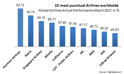 Austrian Airlines was the world’s most punctual airline in March 2017. This can be seen in the latest statistics from flightstats.com for global airlines. With an arrival on-time rate of 92.72%, Austrian Airlines was ahead of Spanish Iberia (90.74%) and Singapore Airlines (89.19%). Punctuality is measured in the airline industry with <15 minutes. This means that all flights within the 15-minute time window are considered as punctual.