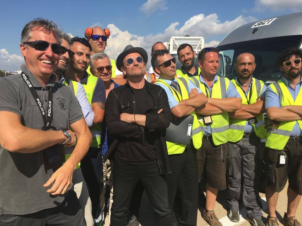 Nelle immagini del gestore aeroportuale #ADR a Roma Ciampino, uno dei membri degli U2 insieme agli operatori aeroportuali.