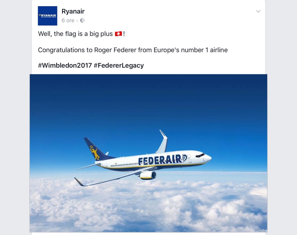 compagnie aeree Ryanair e’ sempre pronta…oggi festeggia Federer Pubblicato da Italiavola il 16 luglio 2017 #Ryanair coglie sempre le opportunità. Pubblicità al tempo giusto a suo ovvio favore. Non è una critica, ma una constazione di come sanno essere immediati. Oggi e’ il momento di #Federer vincitore a #Wimbledon e quindi l’aereo diventa #Federair! Condividi: Fai clic per condividere su Facebook (Si apre in una nuova finestra) Facebook Fai clic qui per condividere su LinkedIn (Si apre in una nuova finestra) LinkedIn Fai clic qui per condividere su Reddit (Si apre in una nuova finestra) Reddit Fai clic qui per condividere su Pinterest (Si apre in una nuova finestra) Pinterest Fai clic qui per condividere su Tumblr (Si apre in una nuova finestra) Tumblr Fai clic per condividere su X (Si apre in una nuova finestra) X Mi piace Caricamento... Correlati