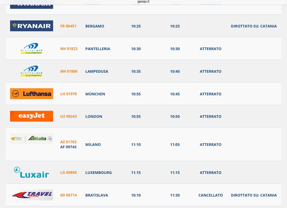 compagnie aeree, rotte Temporali a Palermo, voli dirottati a Catania Pubblicato da Italiavola il 16 luglio 2017 Questa mattina a causa del #maltempo a #Palermo, due voli sono stati dirottati a #Catania. FR6451 #Bergamo #Ryanair B737/800 EI-FOB 6D6714 #Bratislava #TravelService B737/800 OK-TVL Condividi: Fai clic per condividere su Facebook (Si apre in una nuova finestra) Facebook Fai clic qui per condividere su LinkedIn (Si apre in una nuova finestra) LinkedIn Fai clic qui per condividere su Reddit (Si apre in una nuova finestra) Reddit Fai clic qui per condividere su Pinterest (Si apre in una nuova finestra) Pinterest Fai clic qui per condividere su Tumblr (Si apre in una nuova finestra) Tumblr Fai clic per condividere su X (Si apre in una nuova finestra) X Mi piace Caricamento... Correlati