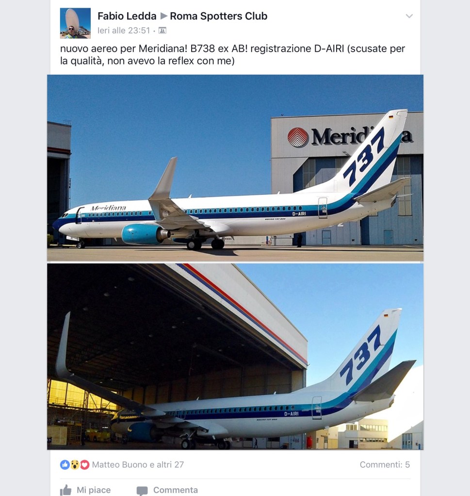 E’ decollato questa sera da Olbia alle 20:09 come ISS7031 il Boeing 737/86J D-AIRI della Meridiana. La destinazione è Milano Malpensa dove atterrerà fra qualche minuto. L’aereo, è quello con la colorazione Eastern Airways.