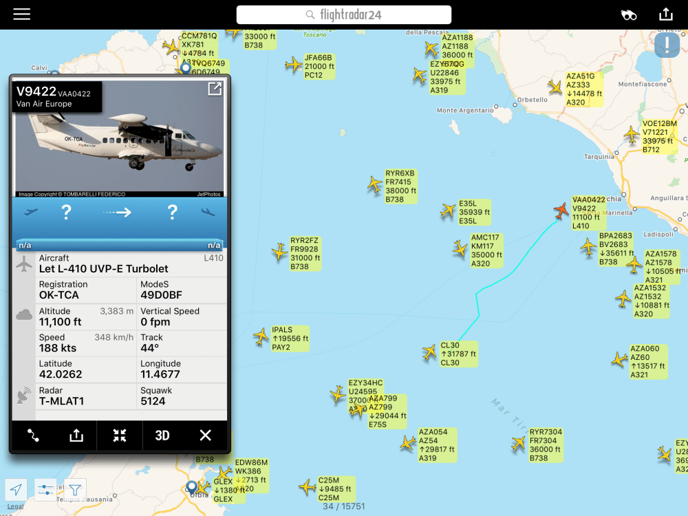 In tempo reale vi aggiorniamo sulla cosa che riguarda i passeggeri umbri che avevano volato la settimana scorsa con #FlyMarche. Qui nell’immagine si vede il Let410 OK-TCA della Van Air Europe che e’ a FL110, 11000ft, quasi sull’Argentario volando da Olbia verso #Perugia. Non c’era come partenza sull’orario dell’aeroporto di #Olbia.