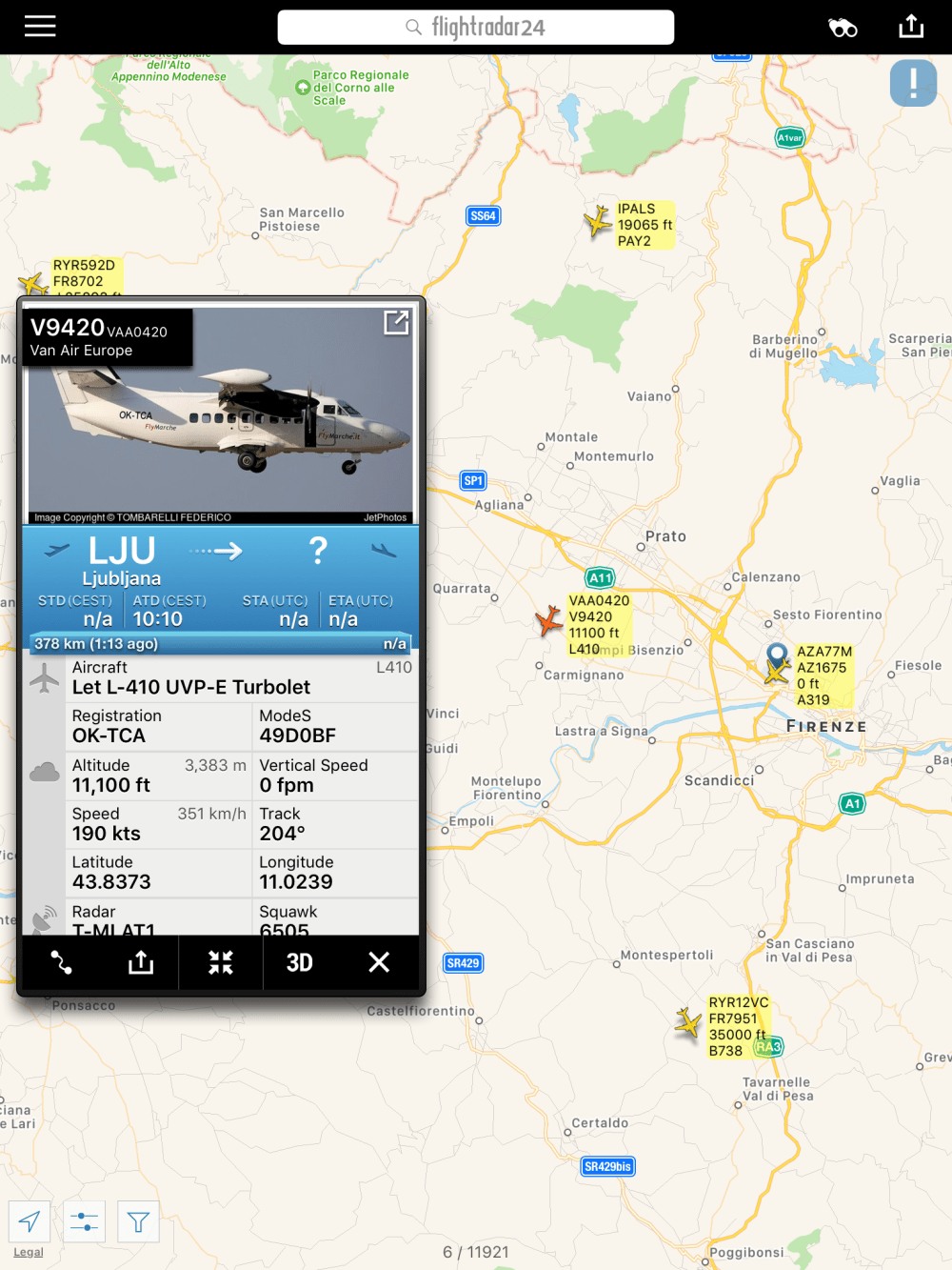 In questo momento il volo VAA420 della Van Air Europe sta sorvolando la Toscana con prua sud verso presumibilmente Olbia. E’ decollato alle 10:10 da Lubiana OK-TCA il Let410 della compagnia ceca. Se atterrerà ad Olbia evidentemente volerà poi verso Perugia, per trasportarli a casa. Dopo l’arrivo a Perugia l’aereo cosa farà?