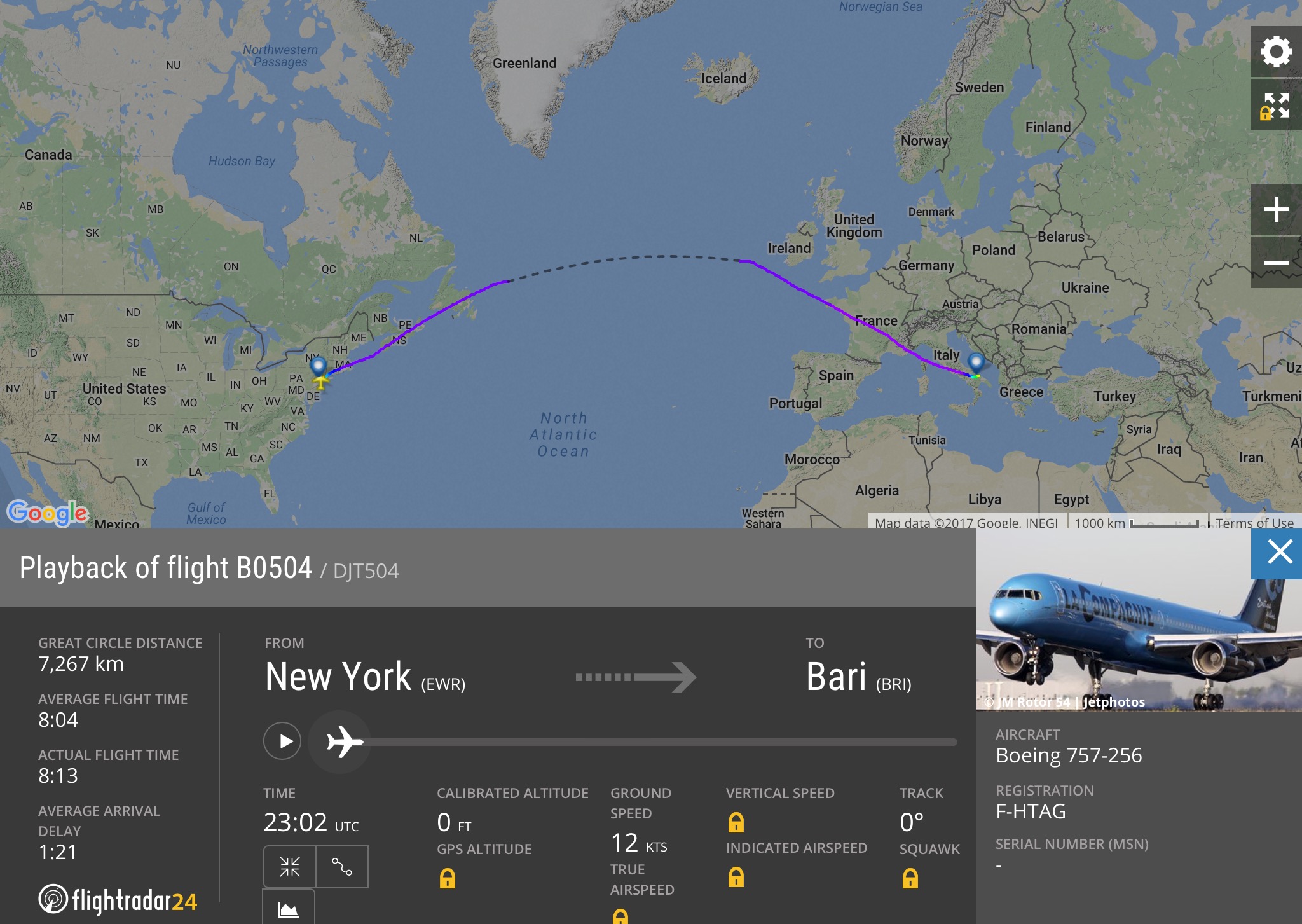 L’aereo è sempre il B757-256 F-HTAG, che ieri da Bari è andato a Parigi e poi ha volato nuovamente verso Newark.