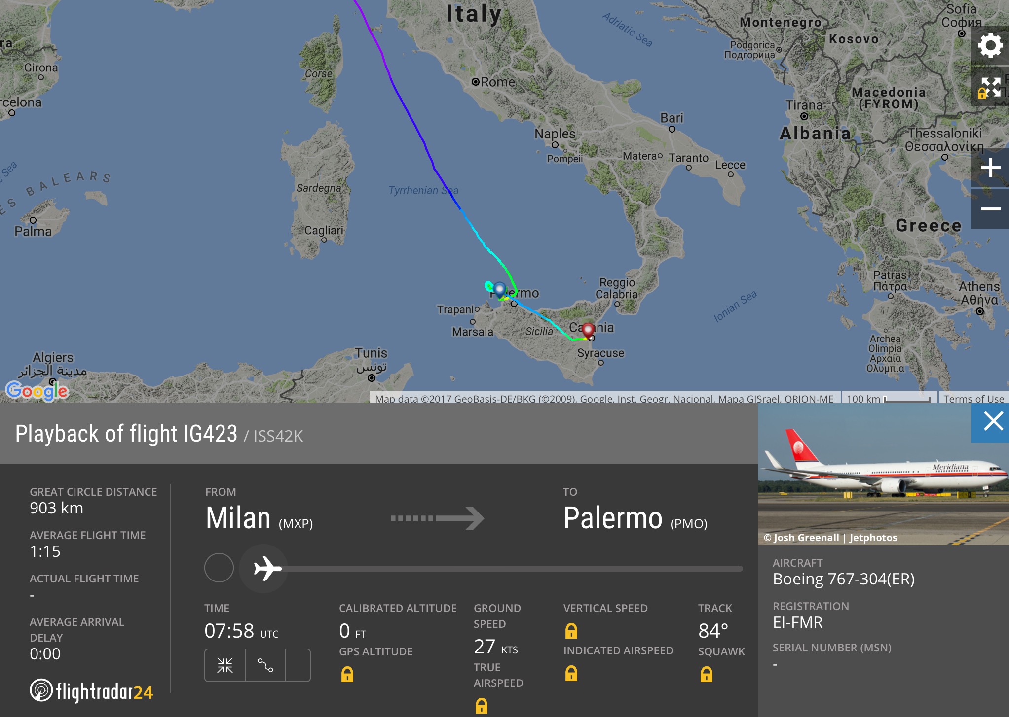 E atterrato a #Catania, anziché a #Palermo il Boeing 767-304ER EI-FMR di #Meridiana proveniente da #Milano #Malpensa. L’aereo non e’ atterrato per 21 a causa delle forti raffiche di #vento, nonostante abbia fatto un tentativo di avvicinamento. L’aereo dovrà operare la rotazione su #NewYork #JFK.