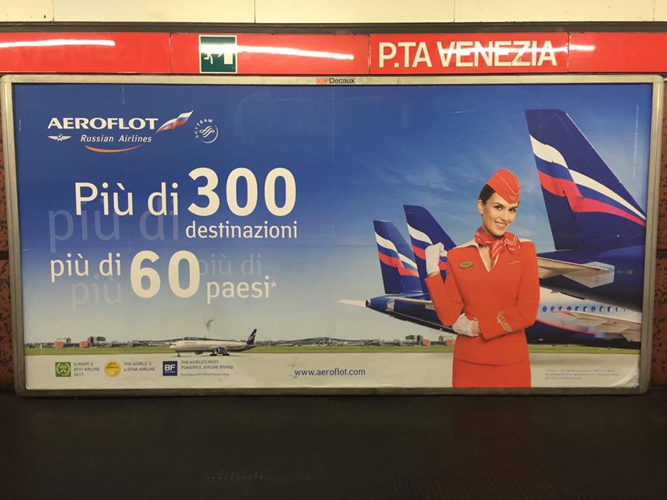 Grazie a Marcogiov possiamo mostrarvi una pubblicità apparsa in questi giorni nella Metro Rossa di Milano dove #Aeroflot pubblicizza le sue 300 destinazioni del network in 60 paesi.