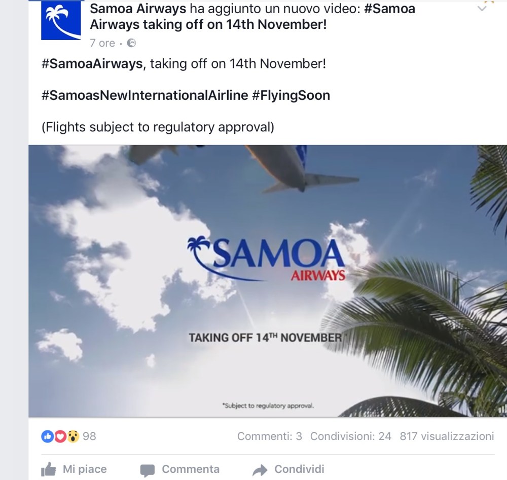 I primi voli saranno operanti dal 14 novembre 2017 come recita questo video presente nella pagina #Facebook di Samoa Airways.