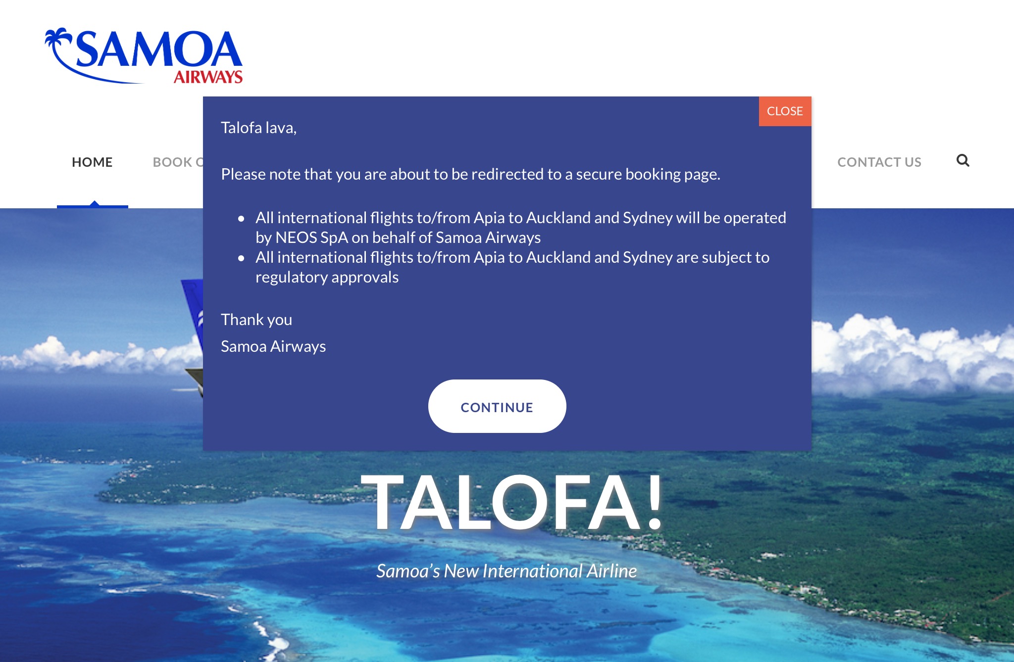 In questo screenshot appare chiaramente dal sito di Samoa Airways, che le operazioni da #Apia #Faleolo a #Auckland e #Sydney saranno svolte da #Neos.