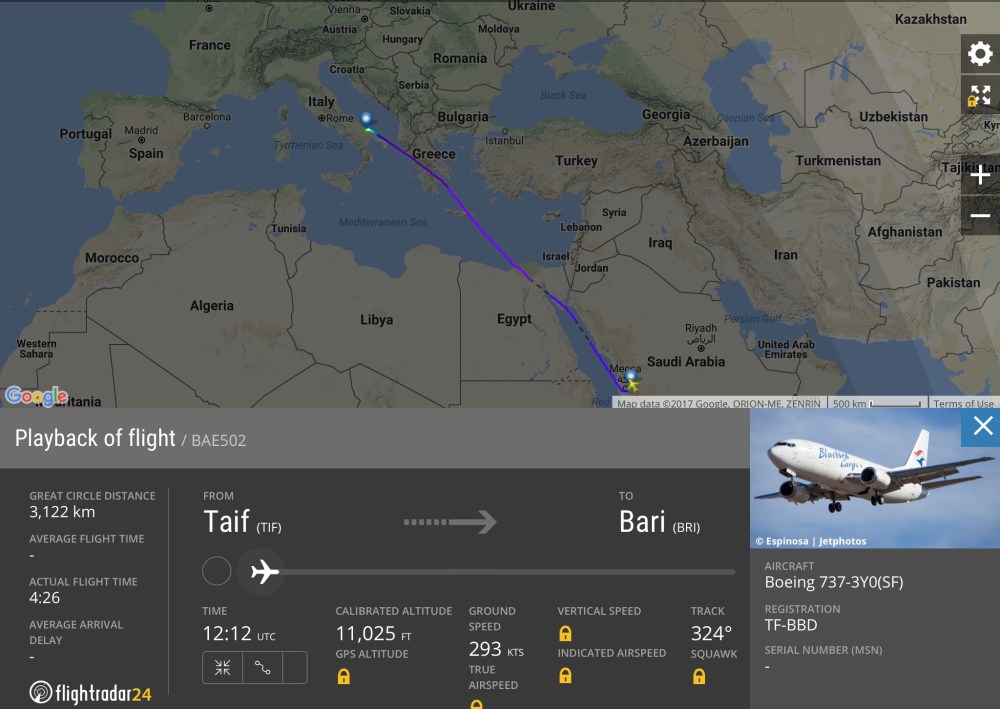 La compagnia aerea islandese BlueBird Cargo con questo B737-3Y0SF TF-BBD ha operato un charter Blackpool – Bari con sosta notturna. La ripartenza per #Taif e’ avvenuta il mattino dopo, cioè ieri e quindi dopo la toccata nell’aeroporto saudita e’ poi ripartito per #Bari nuovamente come si vede dallo screenshot. Successivamente e’ volato a Blackpool.