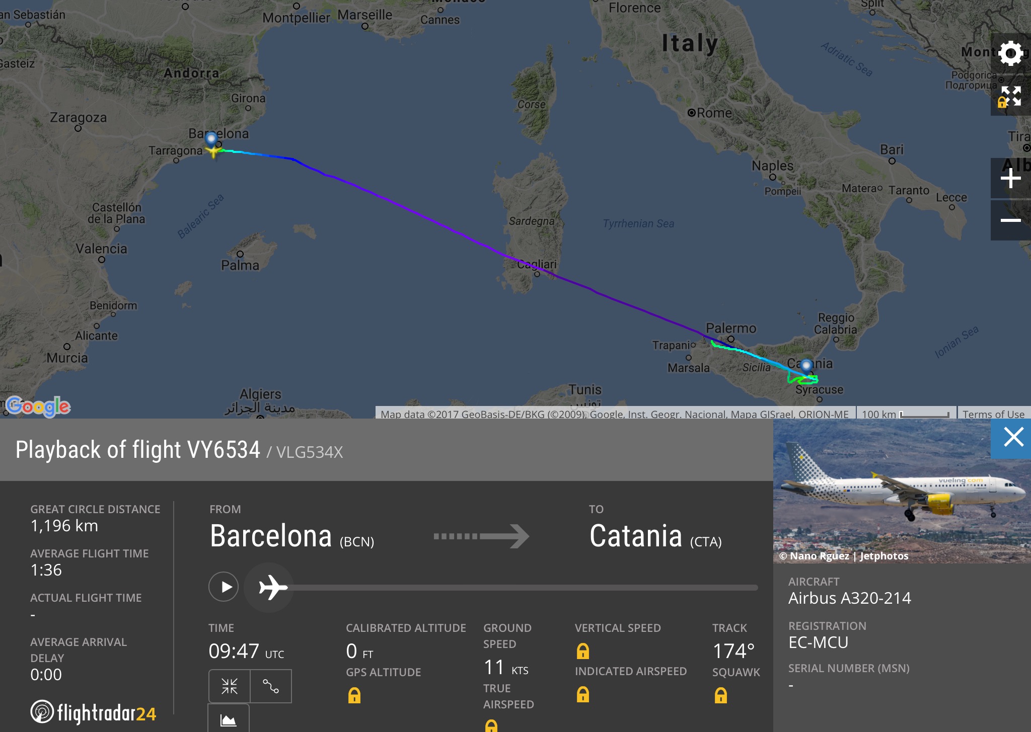 Il volo #Vueling 6534 da #Barcellona dopo qualche #holding e’ atterrato a Palermo, ha scaricato i passeggeri e si e’ riposizionato a Barcellona in ferry flight.