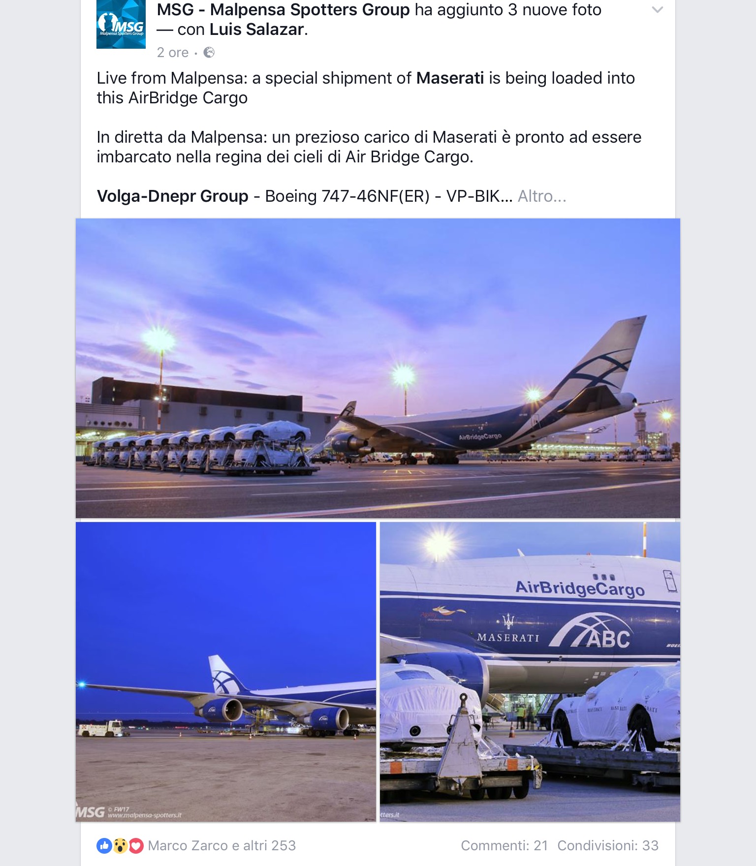 Ieri il B747-400F di #ABC Air Bridge Cargo VP-BIK era brandizzato #Maserati. Un carico di 28 vetture della casa del tridente sono volate da #Milano #Malpensa a #Mosca e poi a #Tokyo. L’aereo giunto da Amsterdam aveva come si vede nelle foto di #MSG Malpensa Spotters Group anche un gigantesco sticker.