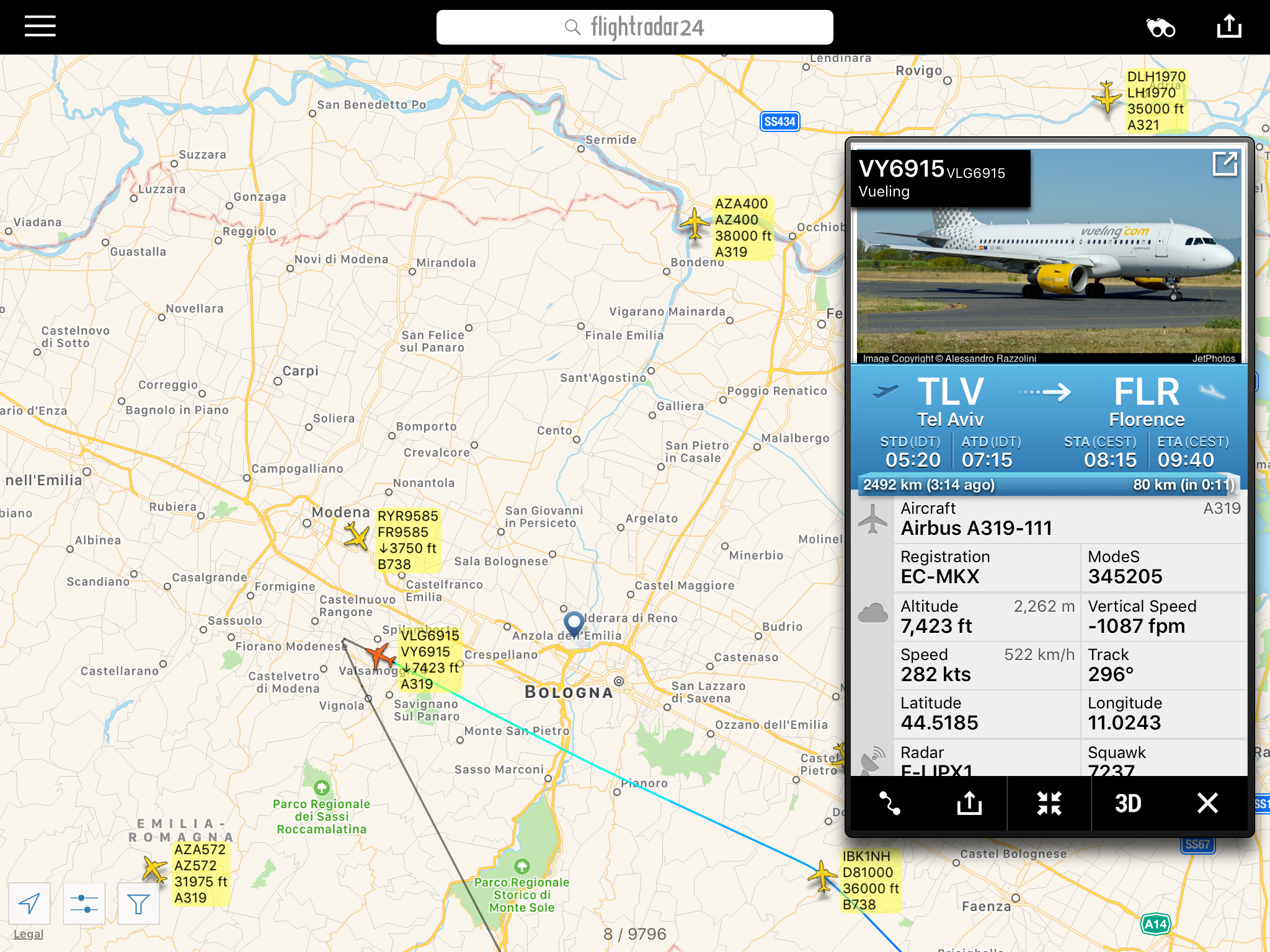 Poi questo volo #Vueling da #TelAviv che non e’ andato ad effettuare i circuiti di attesa ma si e’ diretto immediatamente verso Bologna e non #Firenze, il suo aeroporto di destinazione. Ci sono altri aerei in attesa sull’Appennino con destinazione Firenze.